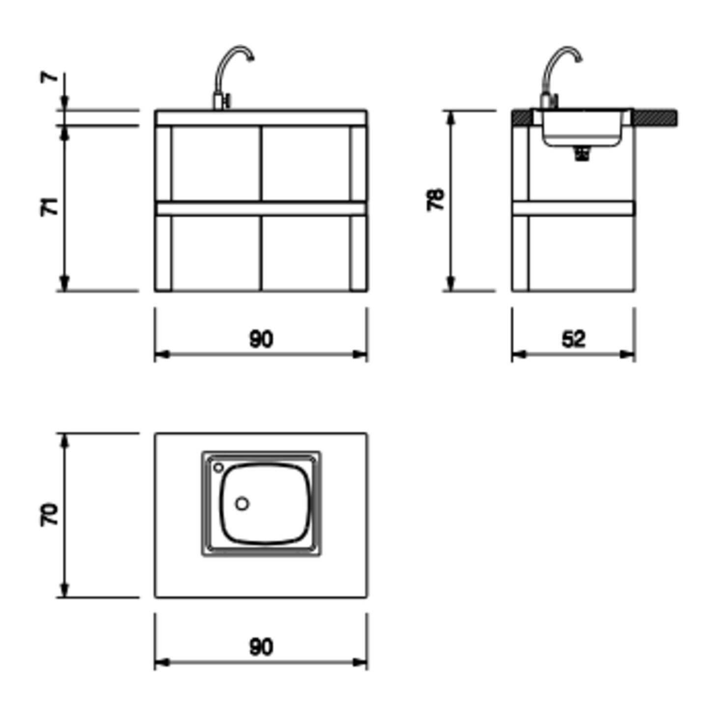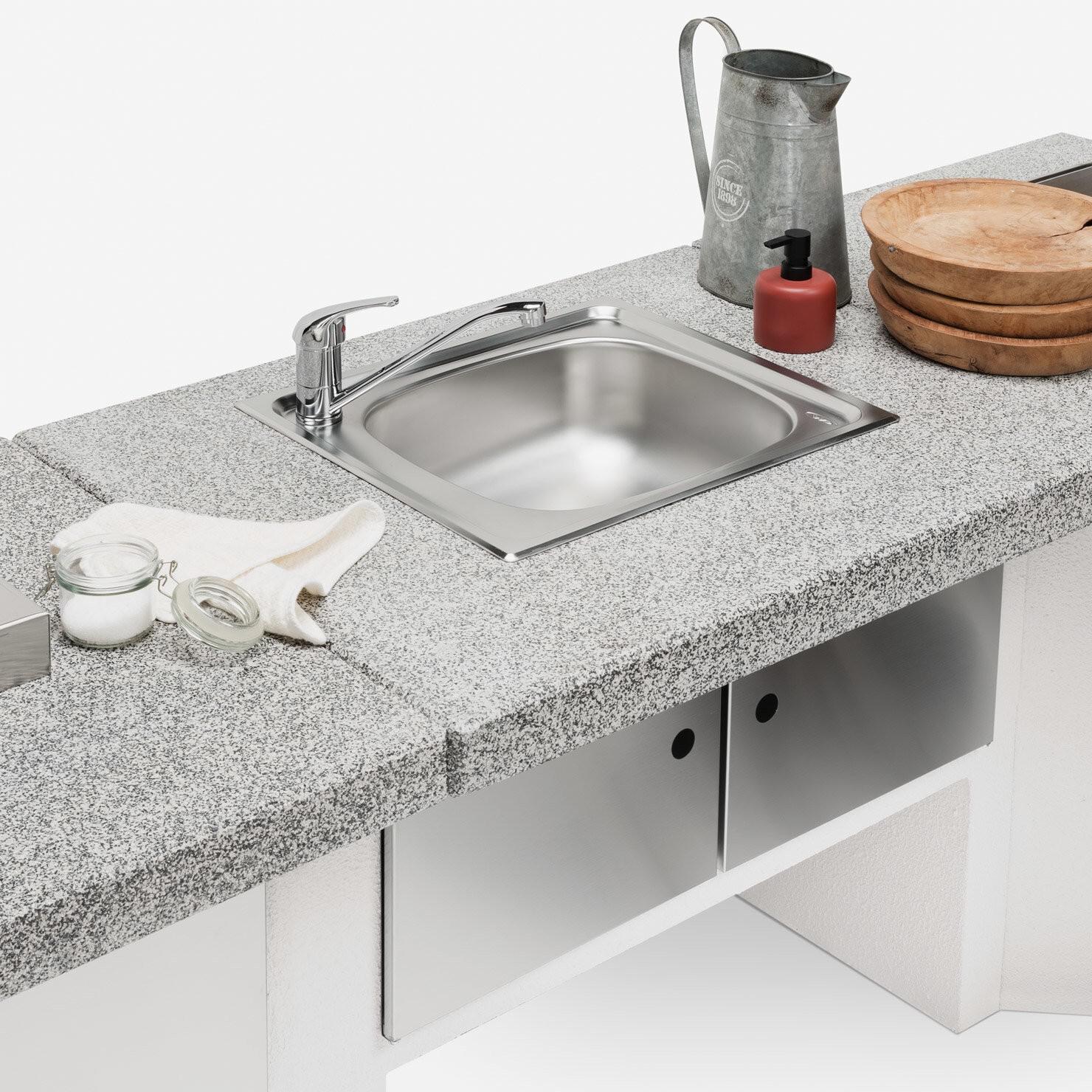 Element je opremljen s pomivalnim koritom iz nerjavečega jekla in vgrajeno mešalno pipo ter ima podstavek z zadnjo ploščo in praktično polico.