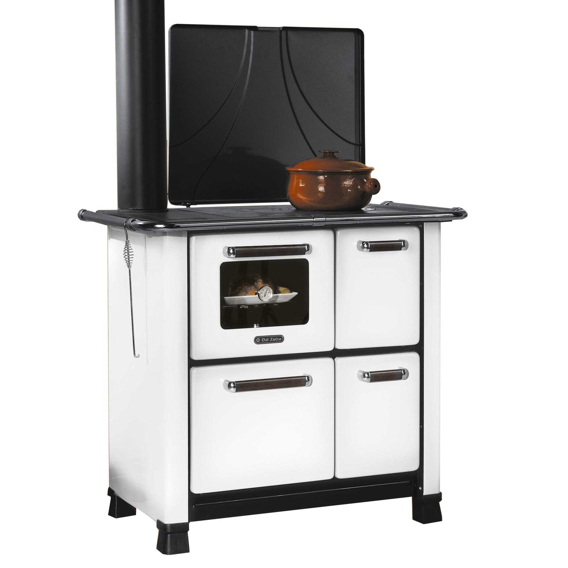 Štedilnik na drva s priključkom za dimnik na levi strani in oblogo iz porcelaniranega jekla. Termometer z žarnico in pečica ter emajlirana ponev. Okvir iz vitrificirane litine. Gladka plošča iz litega železa.