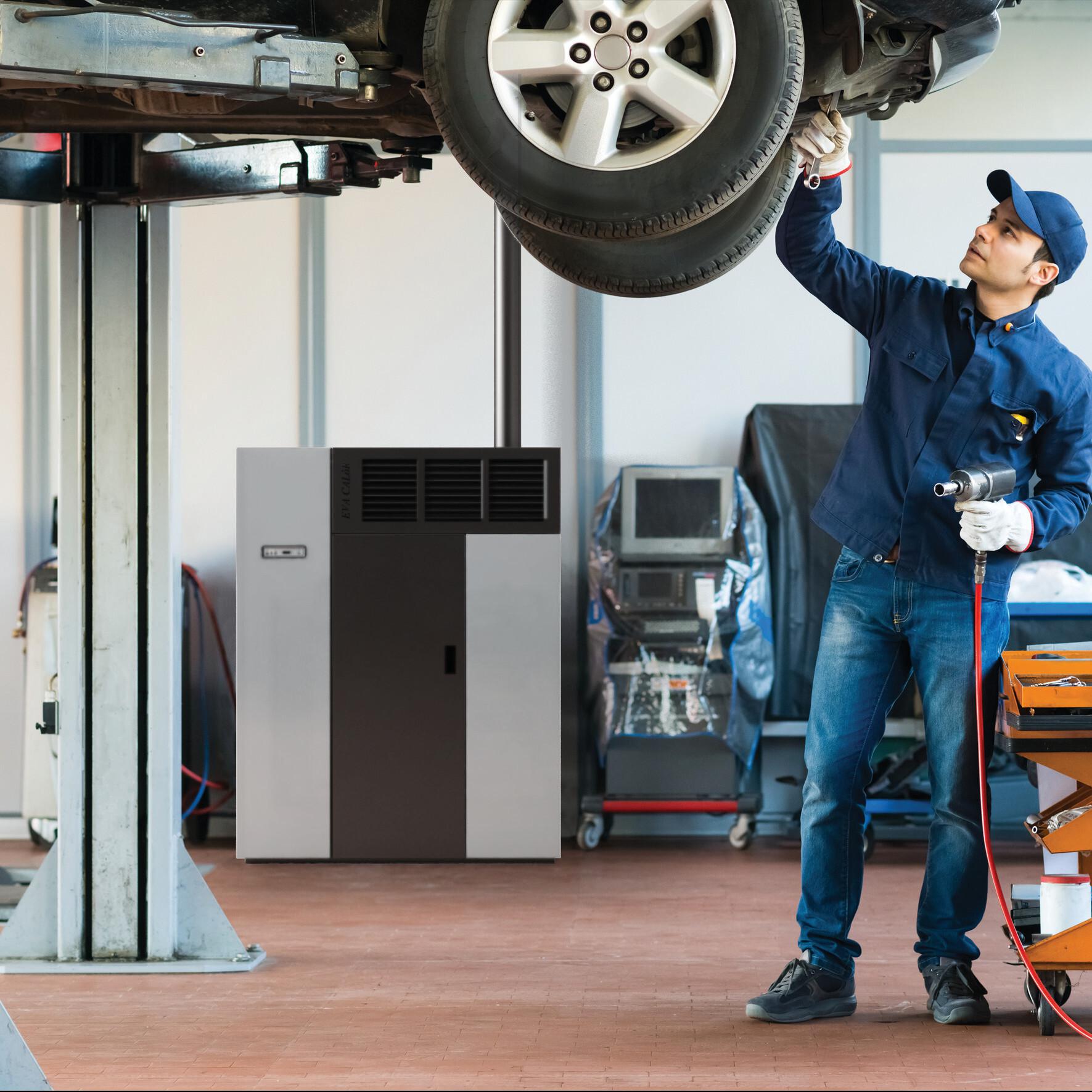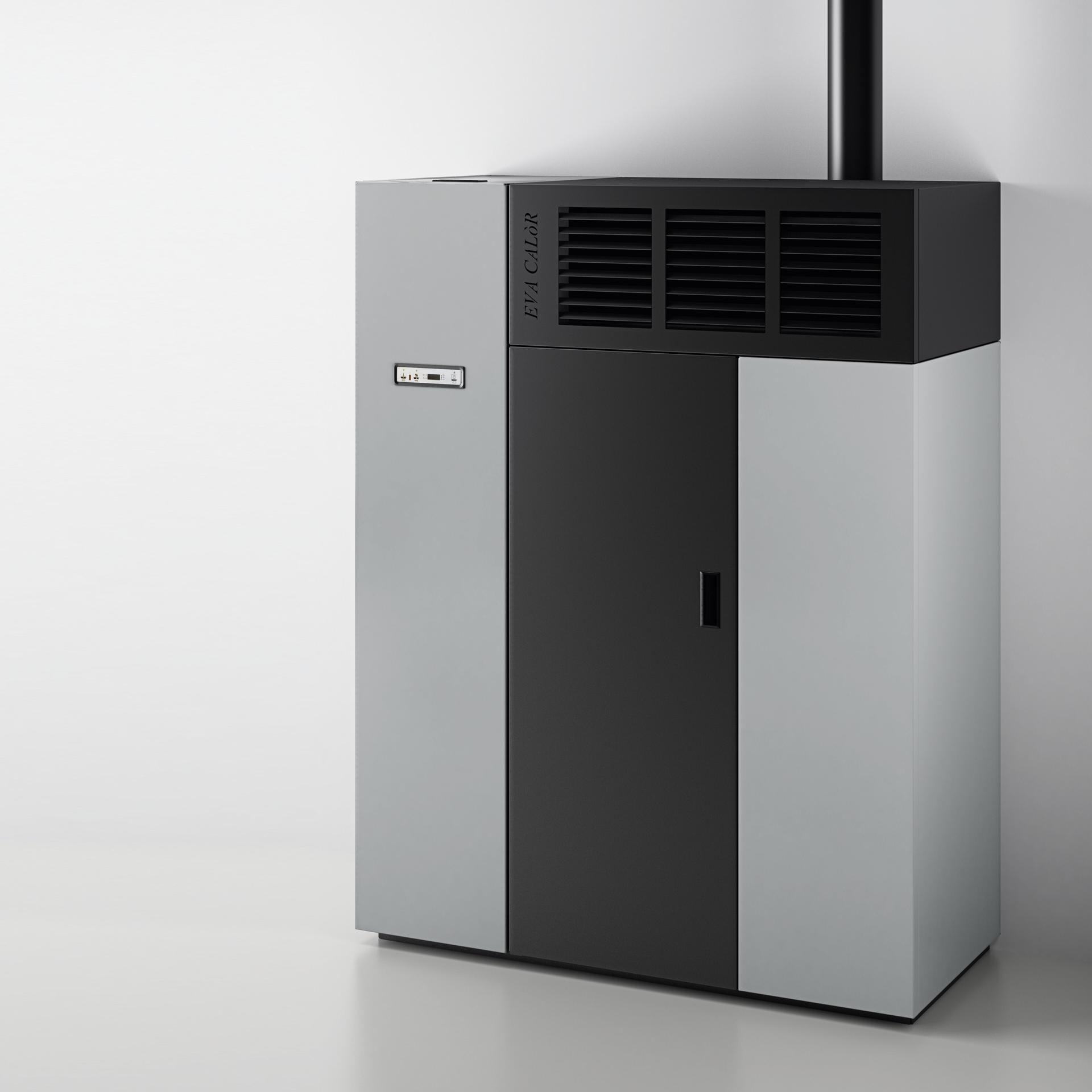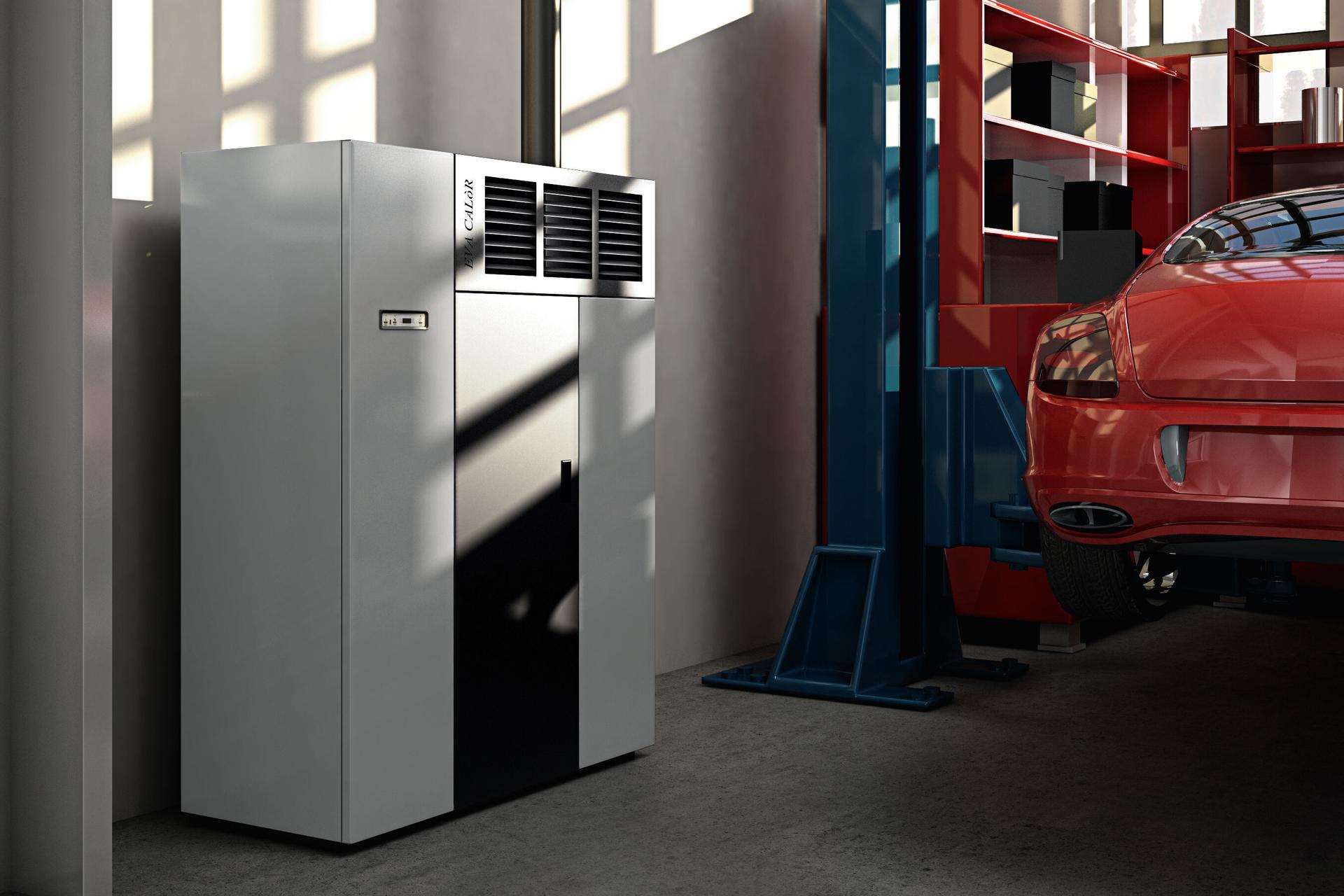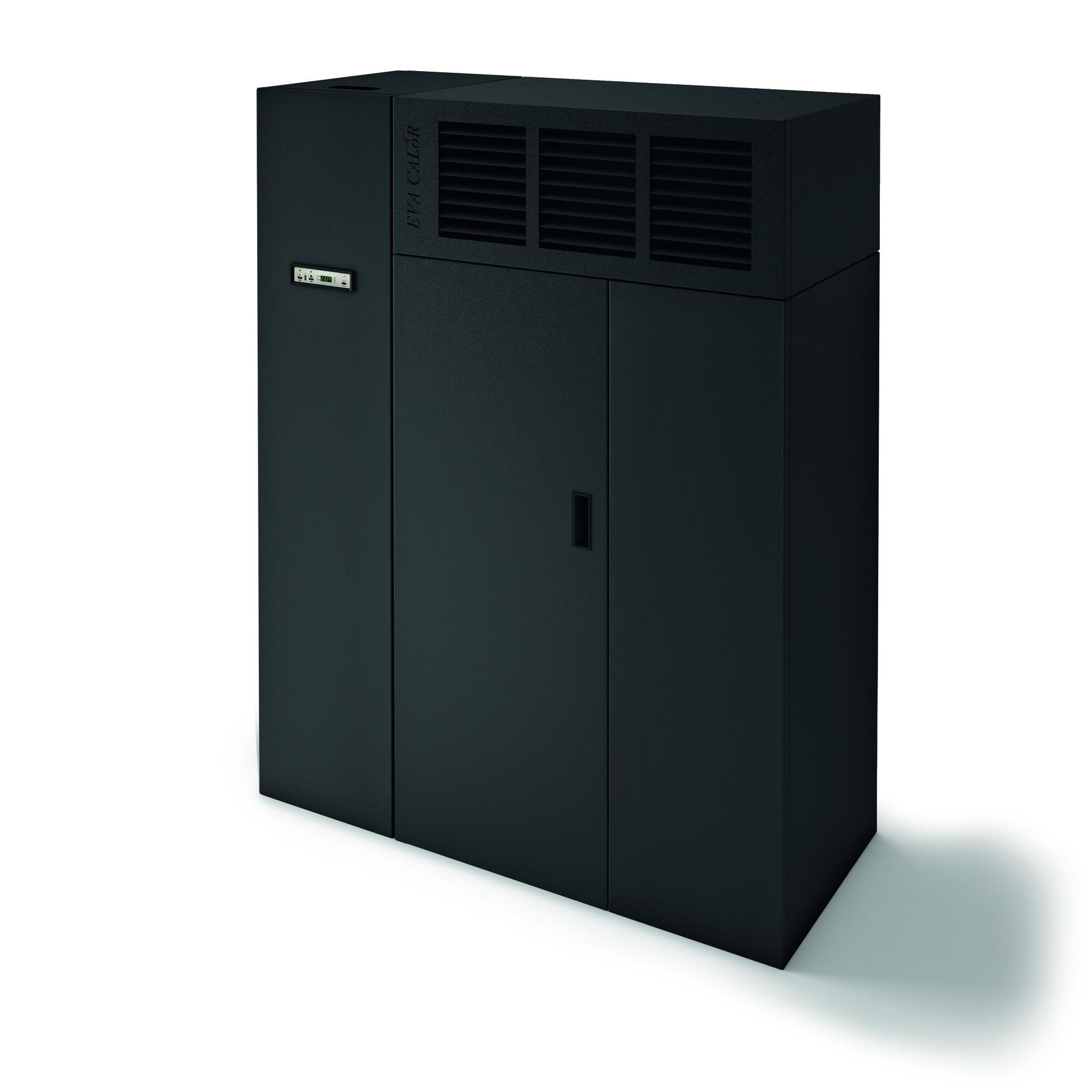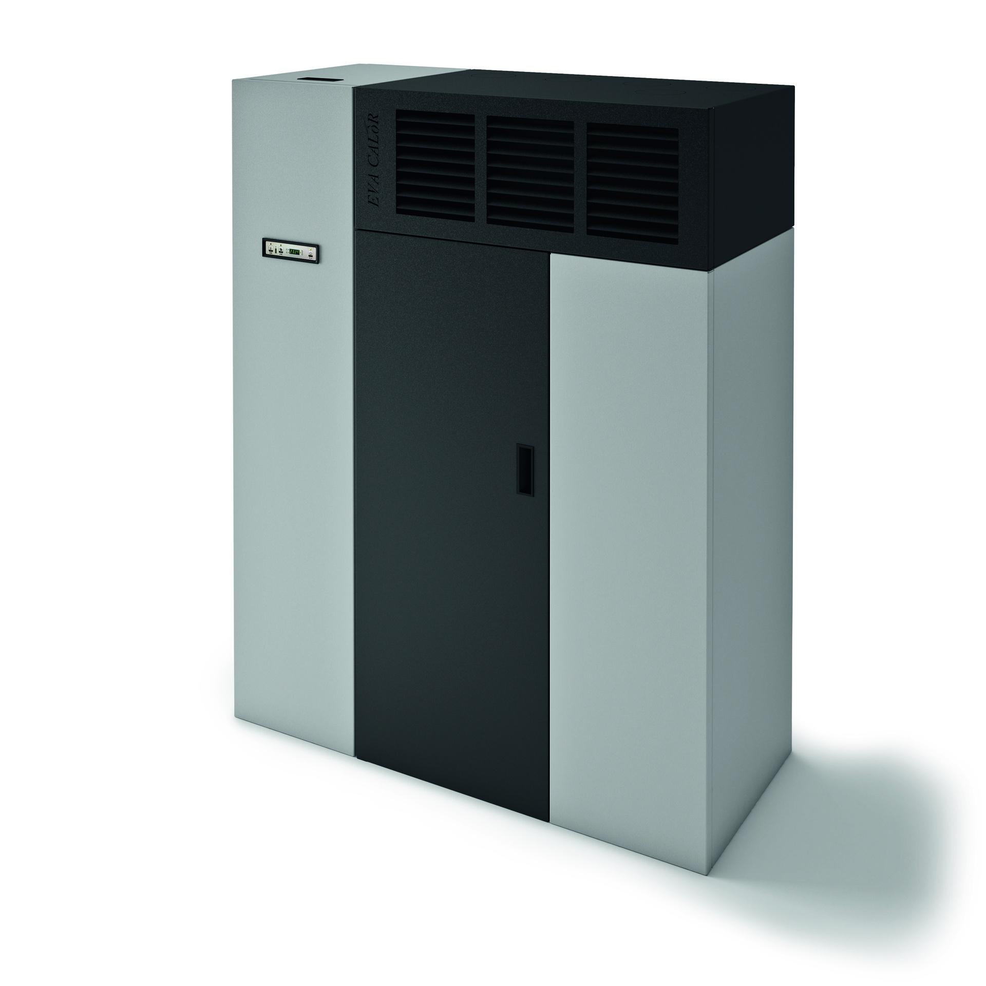 Compact pellet fired hot air generator with front air outlet. Steel casing and double door with removable handle. 5 power levels managed by display in 6 languages. Safety thermostat and manostat with possibility of connection to external thermostat.