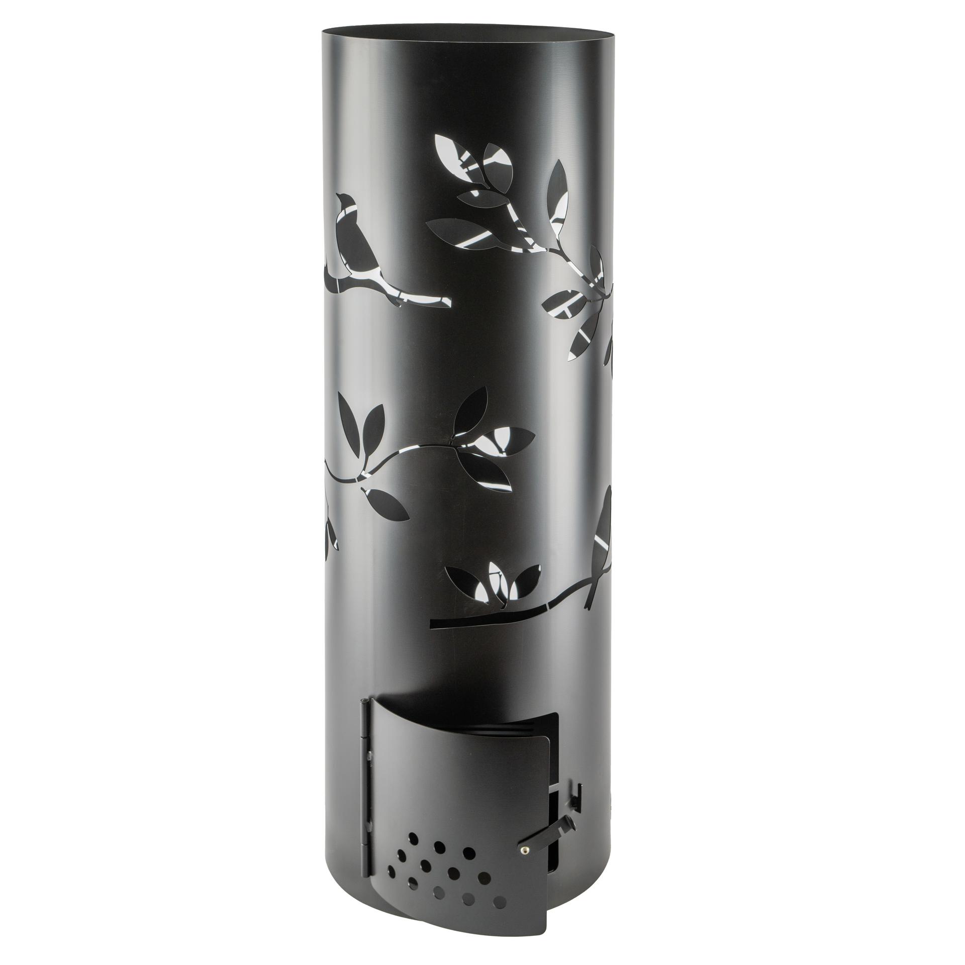 Vrtno kurišče Cielo ima dekorativno izrezljane veje, liste in ptice. Visokotemperaturno črno jeklo.