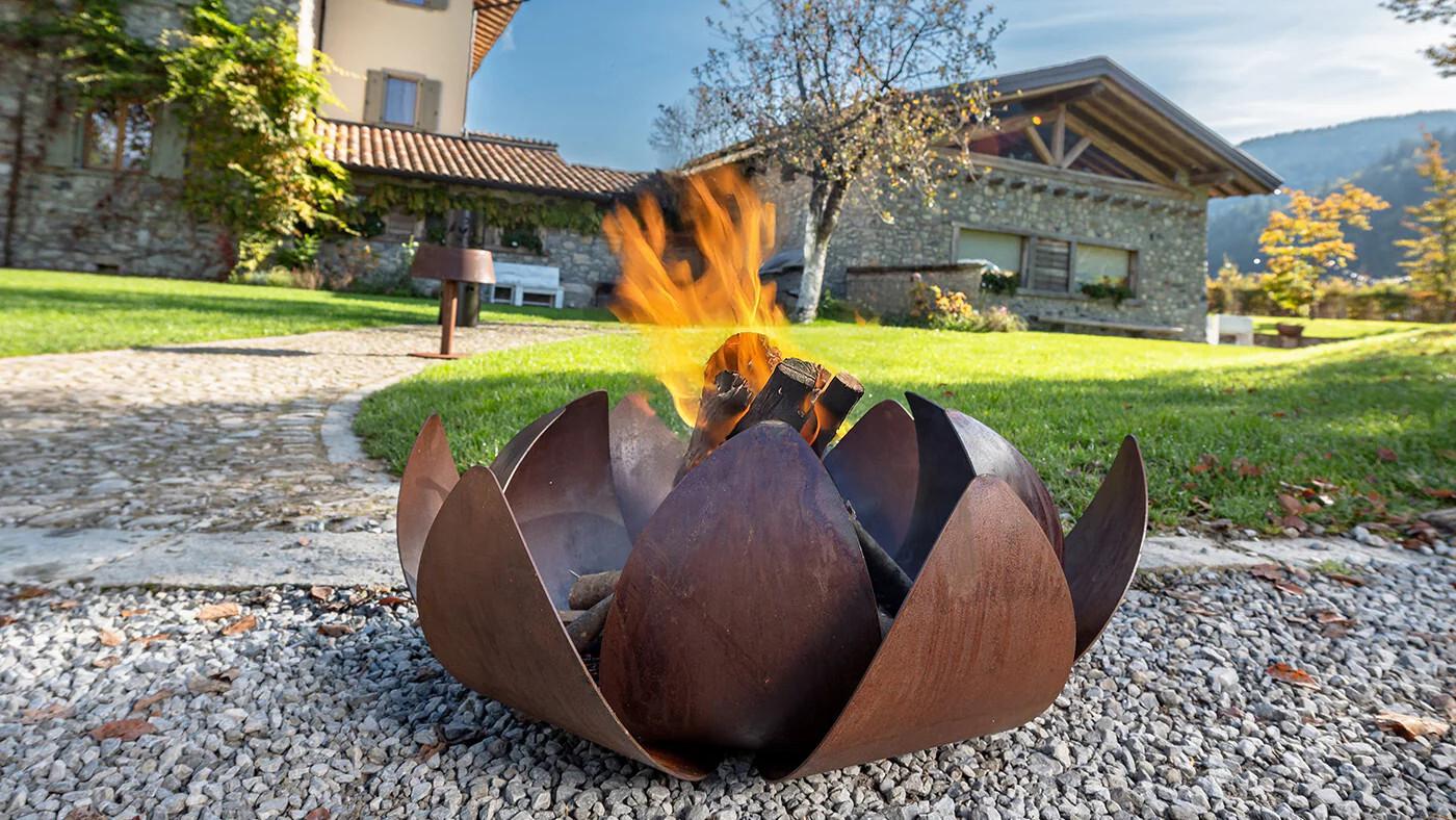 Sčasoma se površina iz kortenskega jekla La FerroTecnica Ninfea obarva s toplo zaščitno plastjo, ki ji daje pristen in brezčasen značaj. Njegova zasnova, ki jo je navdihnila vodna lilija, odraža harmonijo narave in je popolnoma primerna za moderne, rustikalne ali minimalistične vrtove. Struktura prekrivajočih se cvetnih listov ustvarja očarljivo igro svetlobe in senc, zato je osupljiva osrednja točka, tudi če ni osvetljena. Ninfea je zasnovana za stabilnost in zagotavlja odlično dovajanje zraka v kurirče ter omogoča prijetno in sproščeno izkušnjo z ognjem na prostem.