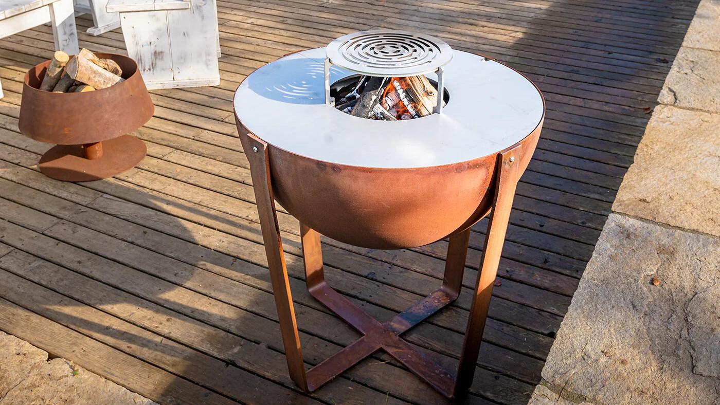Žar Iris se odlikuje po prefinjeni strukturi, minimalistični zasnovi s prekrižanim podstavkom in gladkimi linijami. Jeklo z rjastim učinkom.