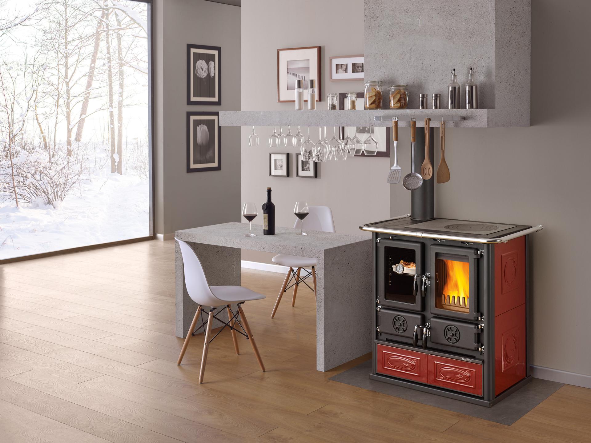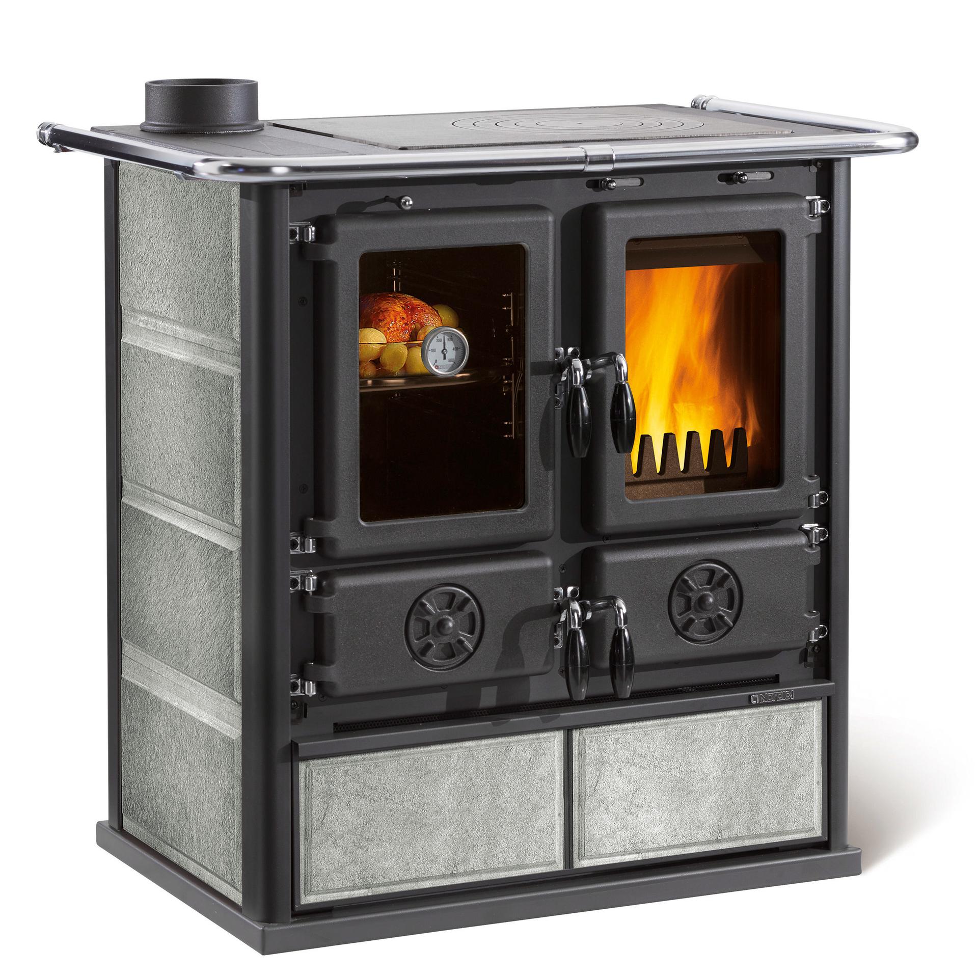 Štedilnik na drva z oblogo iz naravnega kamna in odvodom za dim na zgornji levi ali zadnji levi strani. Zgornja kuhalna plošča in obroči so iz poliranega litega železa. Notranja obloga ognjišča je iz litega železa in ognjevzdržnega materiala. Izvlečni predal za drva. Vrata kurišča so iz litega železa. Keramično steklo.