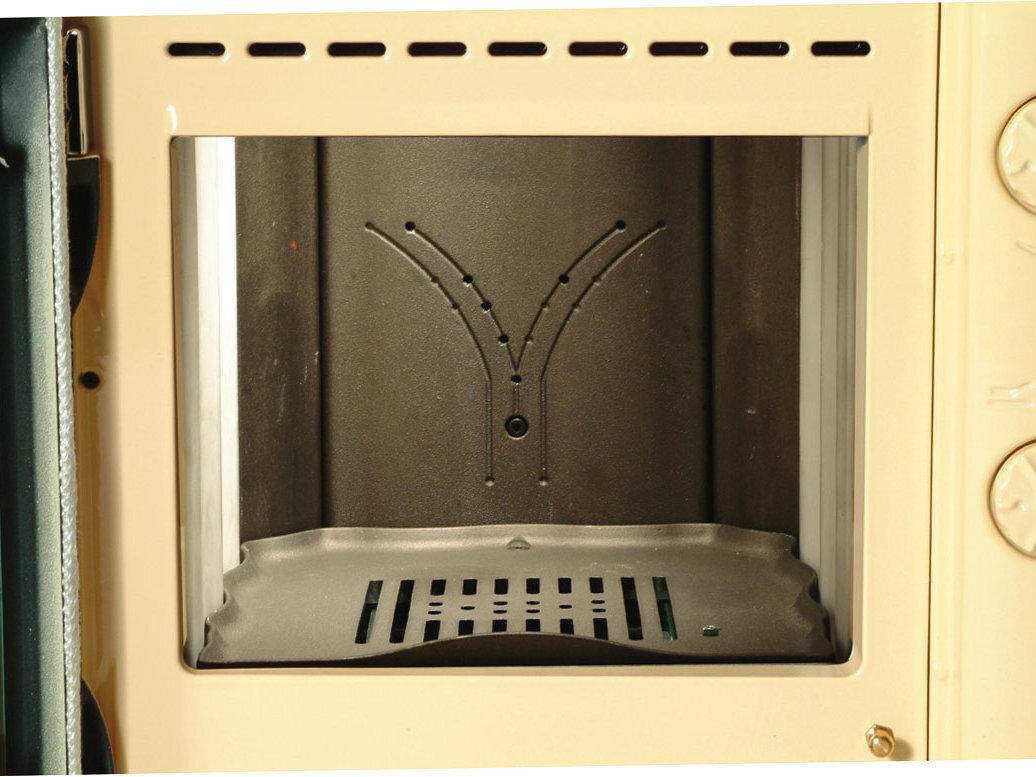 Učinkovito izgorevanje z nastavljivim primarnim in sekundarnim zrakom s sistemom za naknadno zgorevanje za nizke emisije. Nastavljiva litoželezna rešetka in vrata kurišča z dvojnim steklom s širokim pogledom na ogenj. Izvlečni predal za drva.