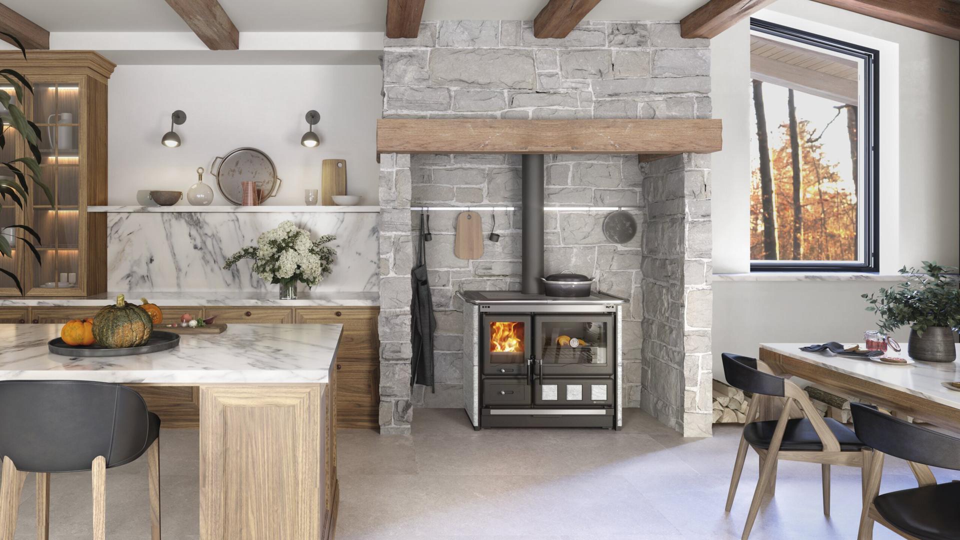 Rosa XXL z 78-litrsko emajlirano pečico in jekleno oblogo, prevlečeno s porcelanom, združuje funkcionalnost z vzdržljivo strukturo. Na voljo v bordo in neskončno beli barvi, zato je kot nalašč primerna za opremljanje kuhinje, dvojno steklo in predal za drva pa povečata njeno vrednost in praktičnost.