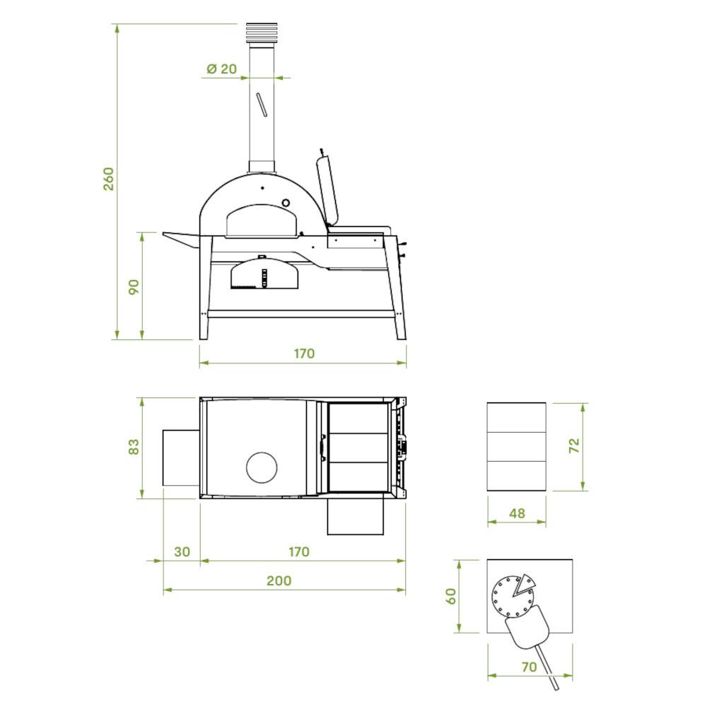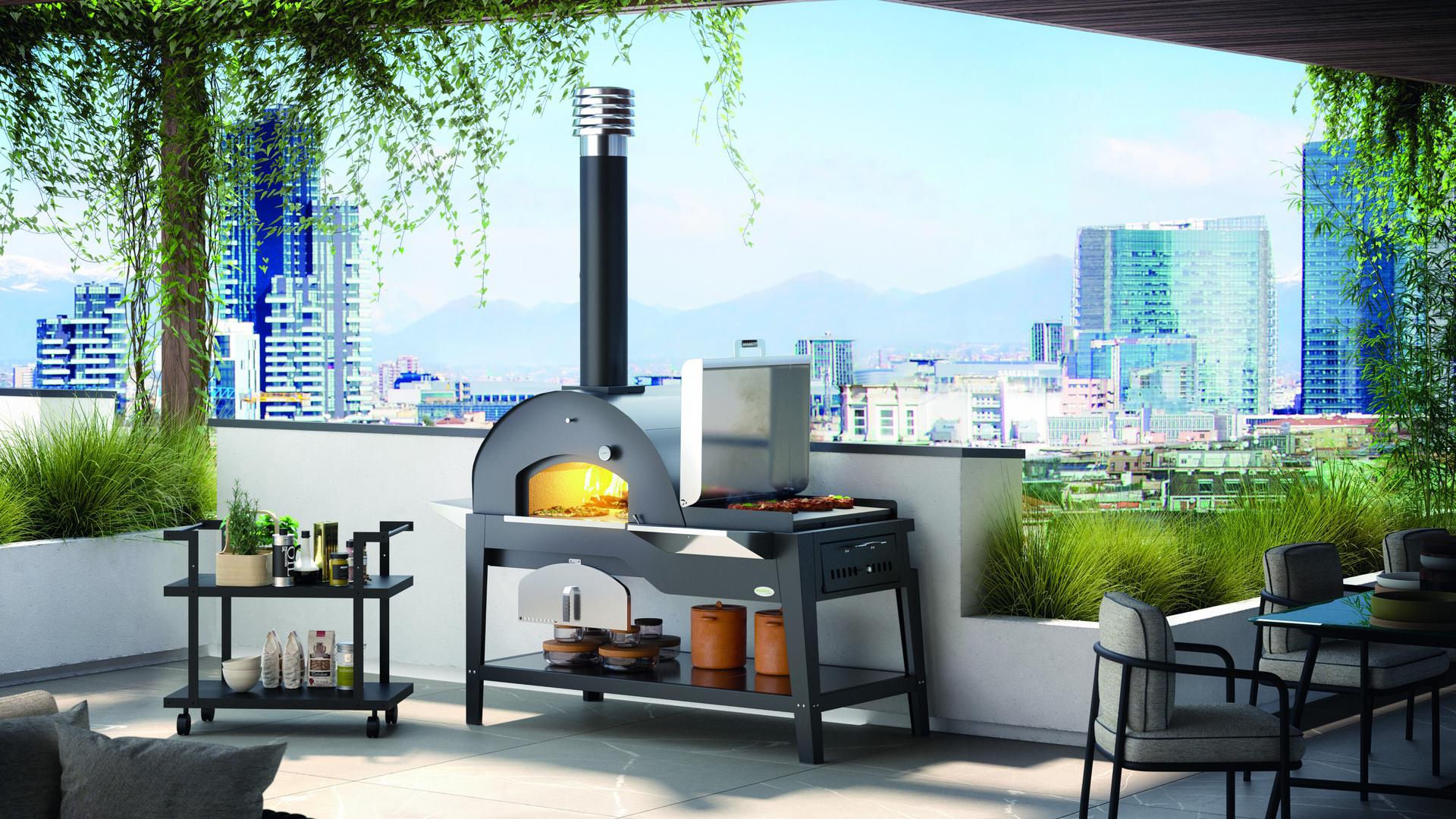 Palazzetti Oreste je elegantna in funkcionalna delovna postaja za kuhanje na prostem, ki v enem kosu vključuje: kuhalno ploščo iz lava kamna, peč na drva, 2 praktični delovni plošči in predal za nalaganje drv in ustvarjanje plamena. Odlična za postavitev na vrt ali pod verando.