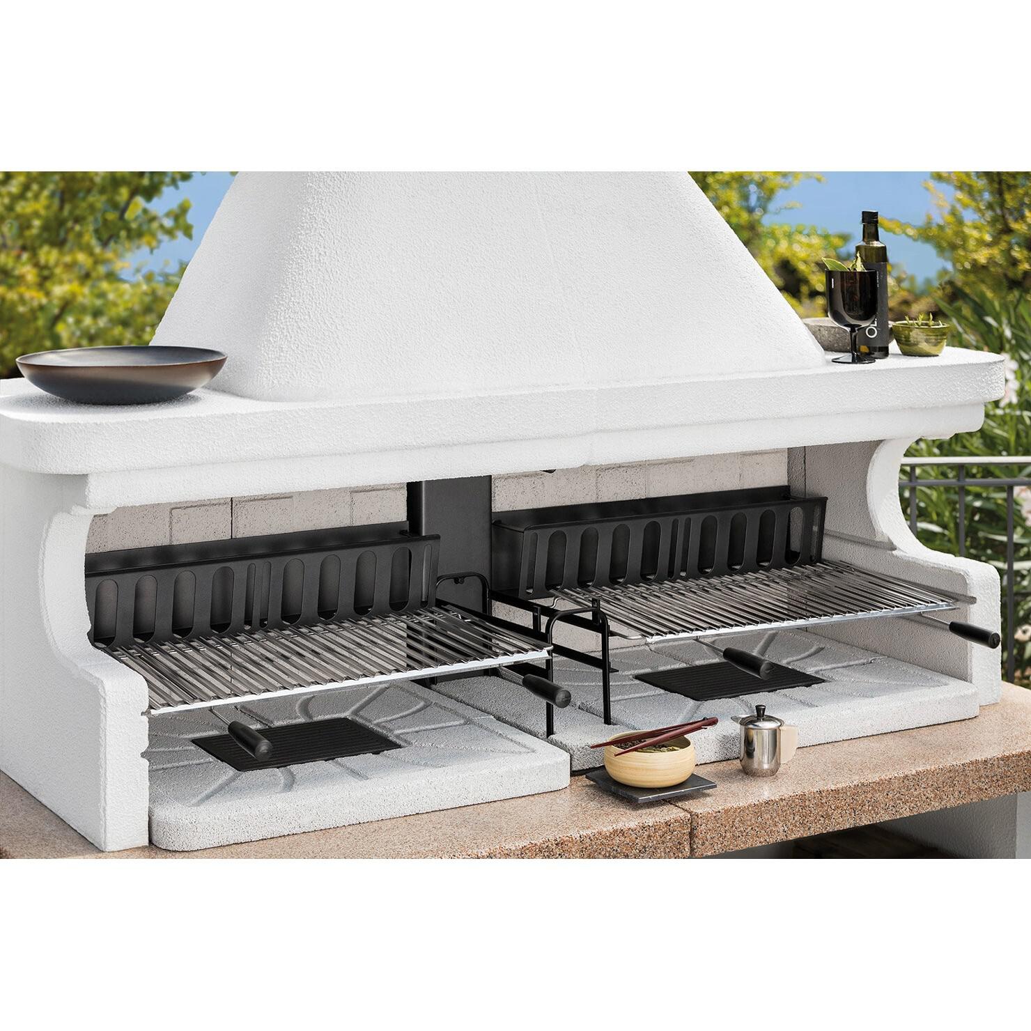 Palazzetti Miami 3 je izdelan tako, da z dvema rešetkama za žar iz nerjavečega jekla nahrani množico ljudi. Vsaka rešetka je nameščena druga ob drugi in je nastavljiva po višini, kar vam omogoča natančen nadzor nad temperaturami pečenja. Kovinska podnapa pod dimnikom ščiti konstrukcijo pred izjemno vročino in vročimi dimnimi plini. Ojačano kurišče ima dvostensko zasnovo z votlimi komorami, v katerih kroži hladilni zrak, kar preprečuje pregrevanje in zagotavlja dolgotrajno vzdržljivost.