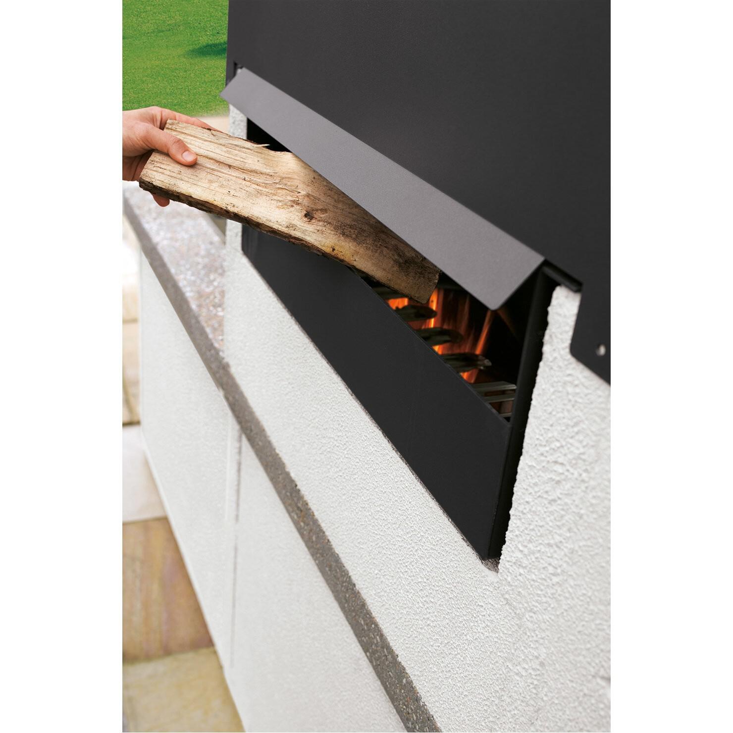 Posebnost kamina Maxime 2 je možnost dvojnega nalaganja - drva lahko dodajate spredaj in zadaj. Možnost nalaganja od zadaj omogoča večjo zmogljivost goriva, zaradi česar je peka na žaru daljša in priročnejša. Vrtni kamin je združljiv z drvmi in ogljem, prostoren vgrajen predal za shranjevanje pod kuriščem pa poskrbi, da je gorivo lepo urejeno.