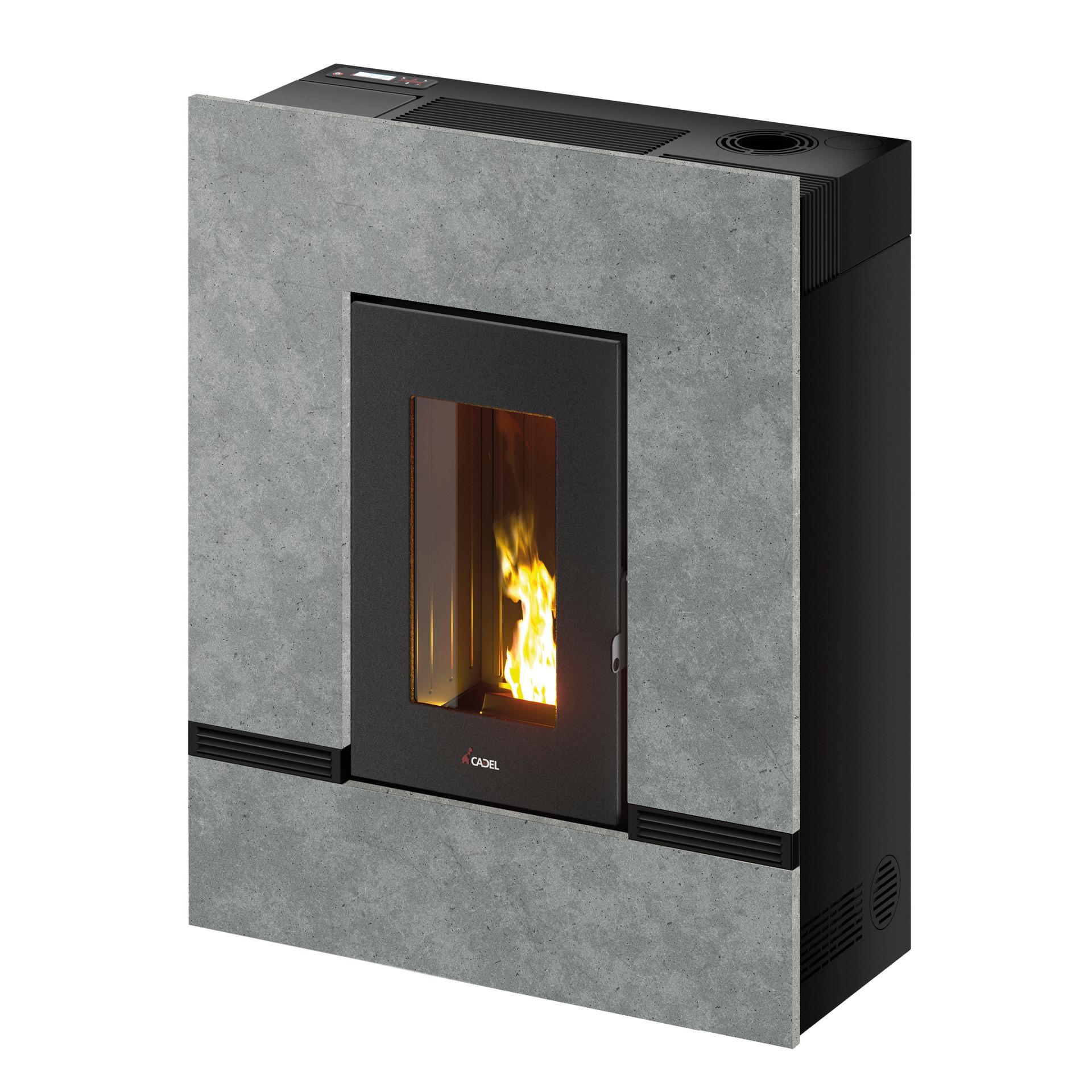 To kaminsko peč z možnostjo napeljave toplega zraka v kanale z več rešitvami za namestitev odlikujeta minimalistična zasnova in kompaktna globina. Dve spodnji prezračevalni rešetki zagotavljata boljšo porazdelitev zraka po vsem prostoru. Obloga iz kamna serpentino.