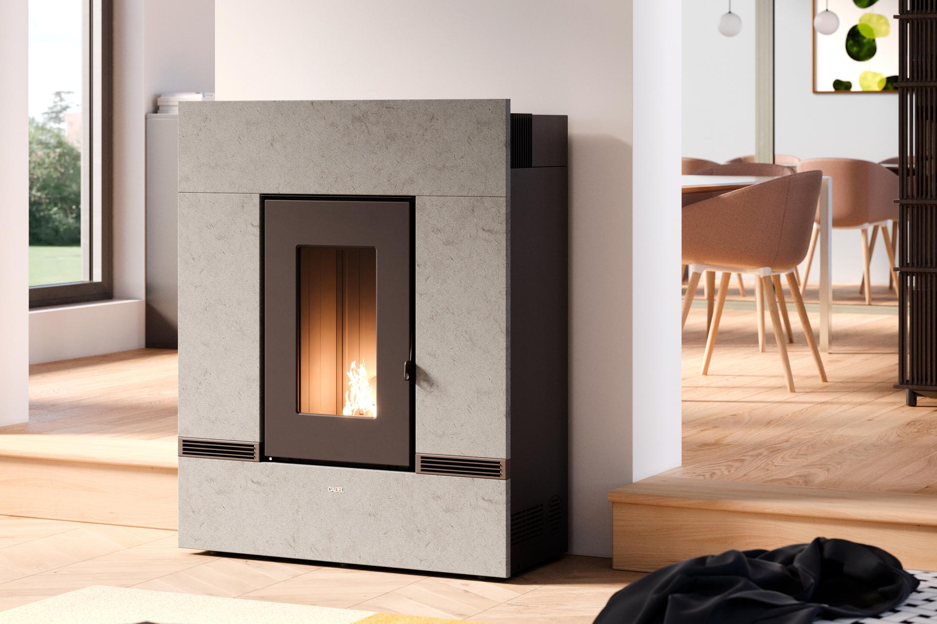 To kaminsko peč z možnostjo napeljave toplega zraka v kanale z več rešitvami za namestitev odlikujeta minimalistična zasnova in kompaktna globina. Dve spodnji prezračevalni rešetki zagotavljata boljšo porazdelitev zraka po vsem prostoru. Obloga iz kamna serpentino.
