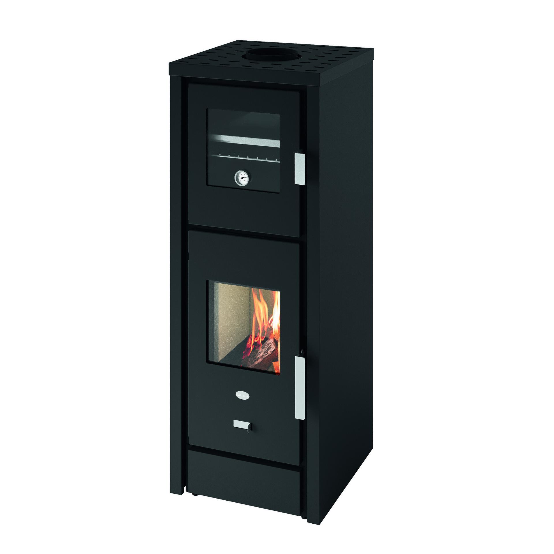Peč na drva s pečico iz nerjavnega jekla, ki je opremljena z odstranljivimi vodili za držalo pladnja, aluminijastim pladnjem in držalom za pladenj. Zgorevalna komora iz vermikulita in nadzor dovoda zraka. Odstranljiv predal za pepel za zbiranje pepela v ločenem predelu. Priključek za dimnik na zgornji strani.