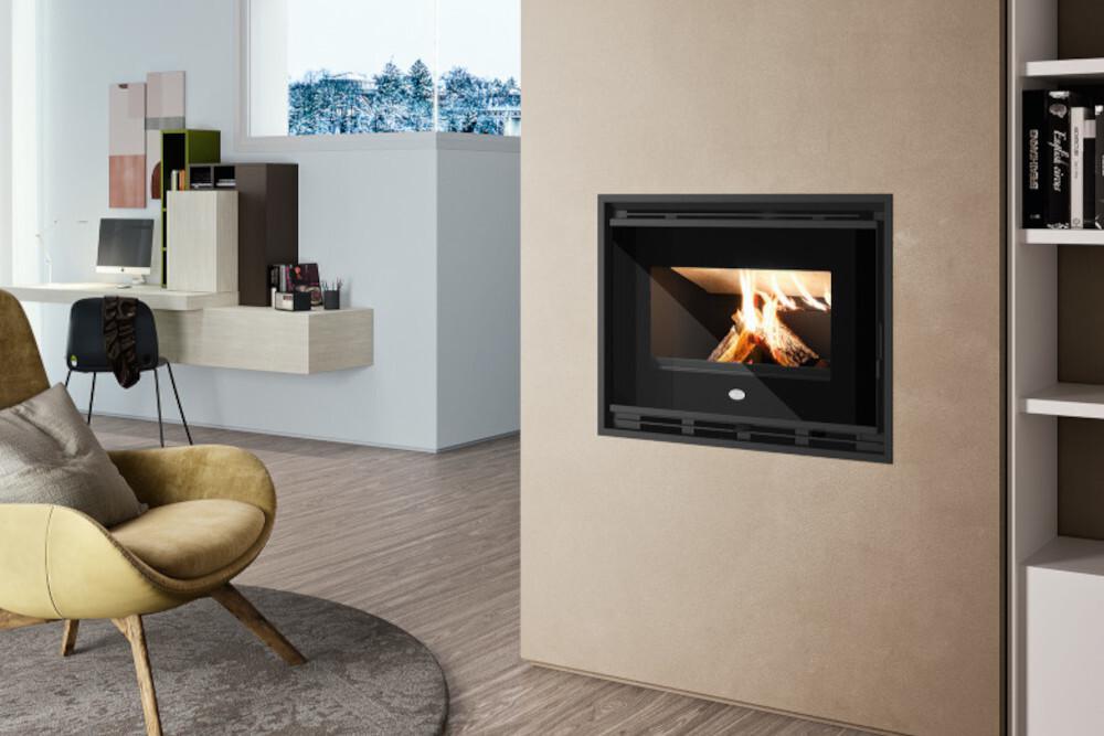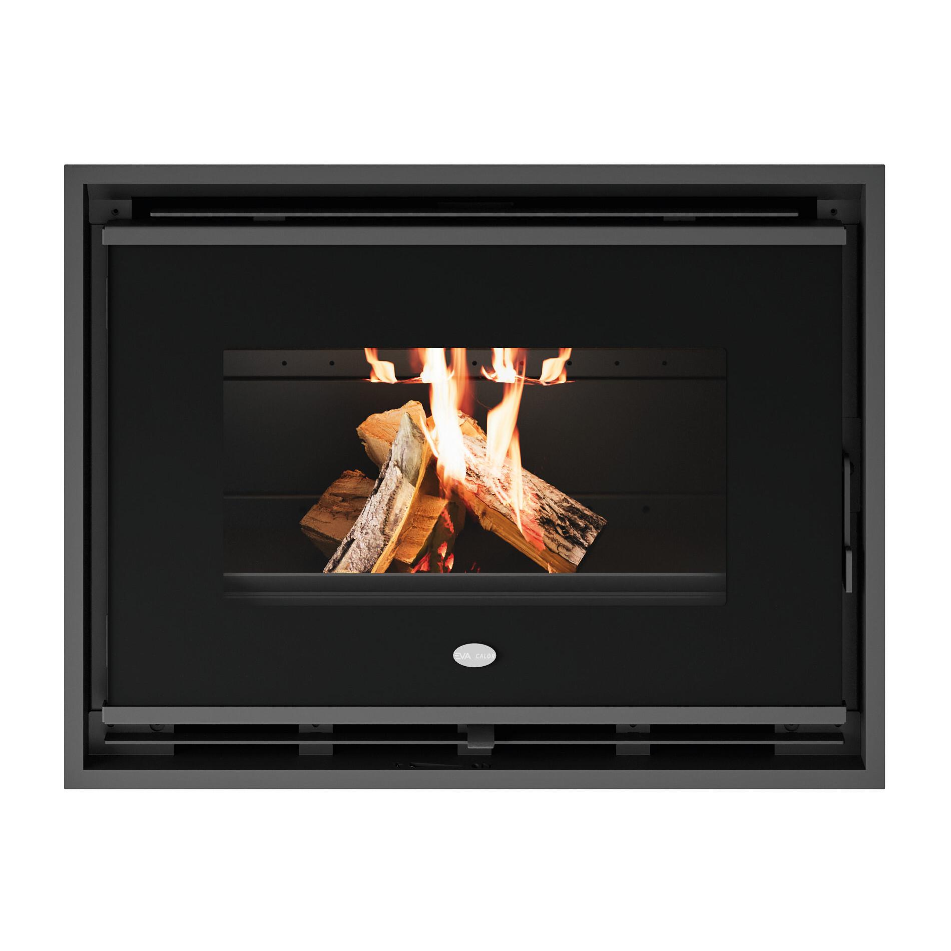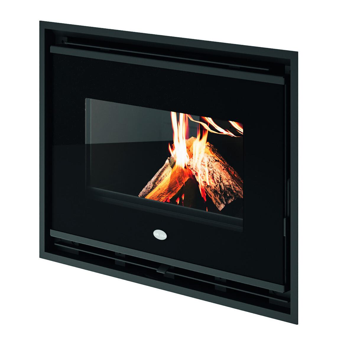 Kamin na drva z zgorevalno komoro iz vermikulita. Linearna zasnova s sprednjimi steklenimi vrati s črnim sitotiskom in odstranljivim ročajem.