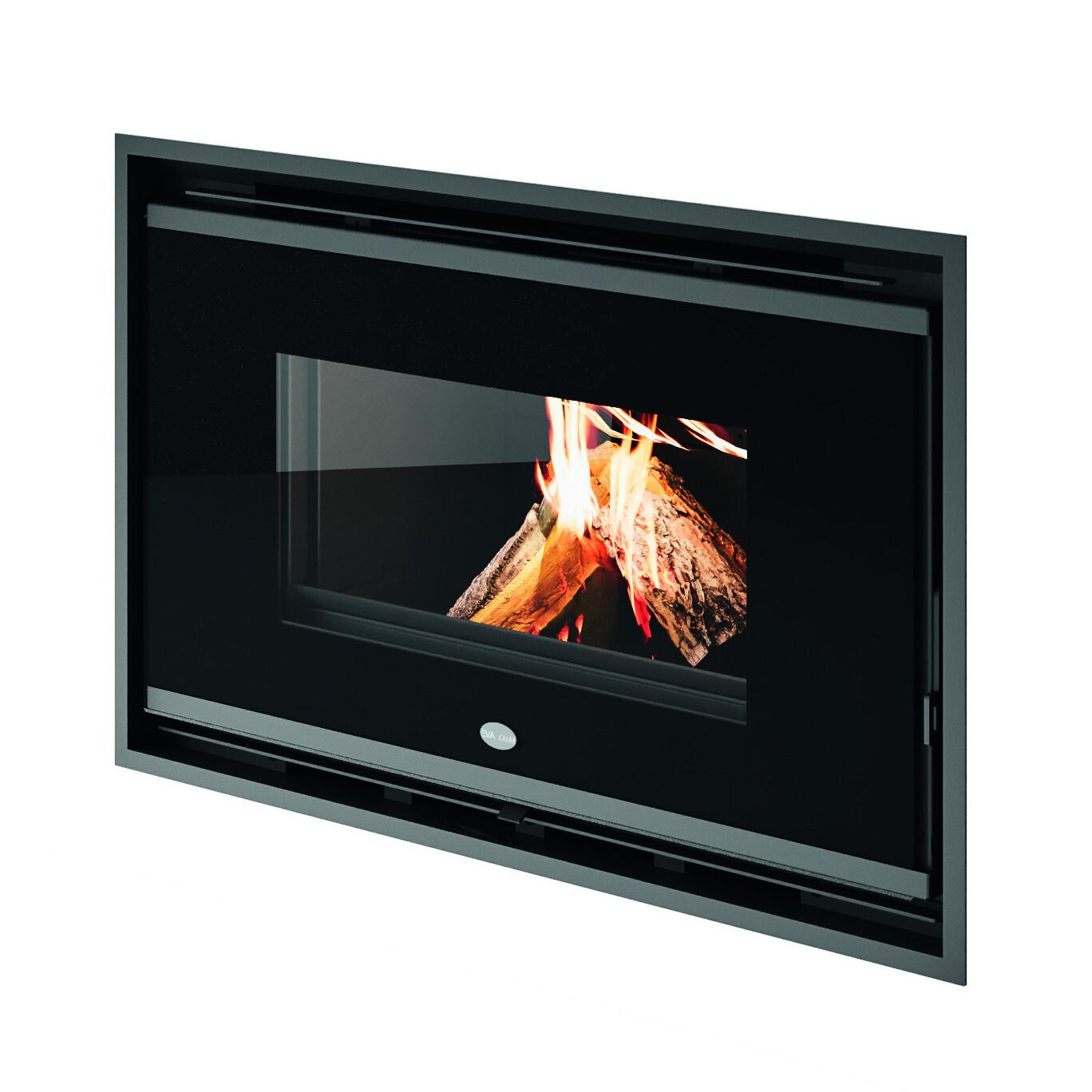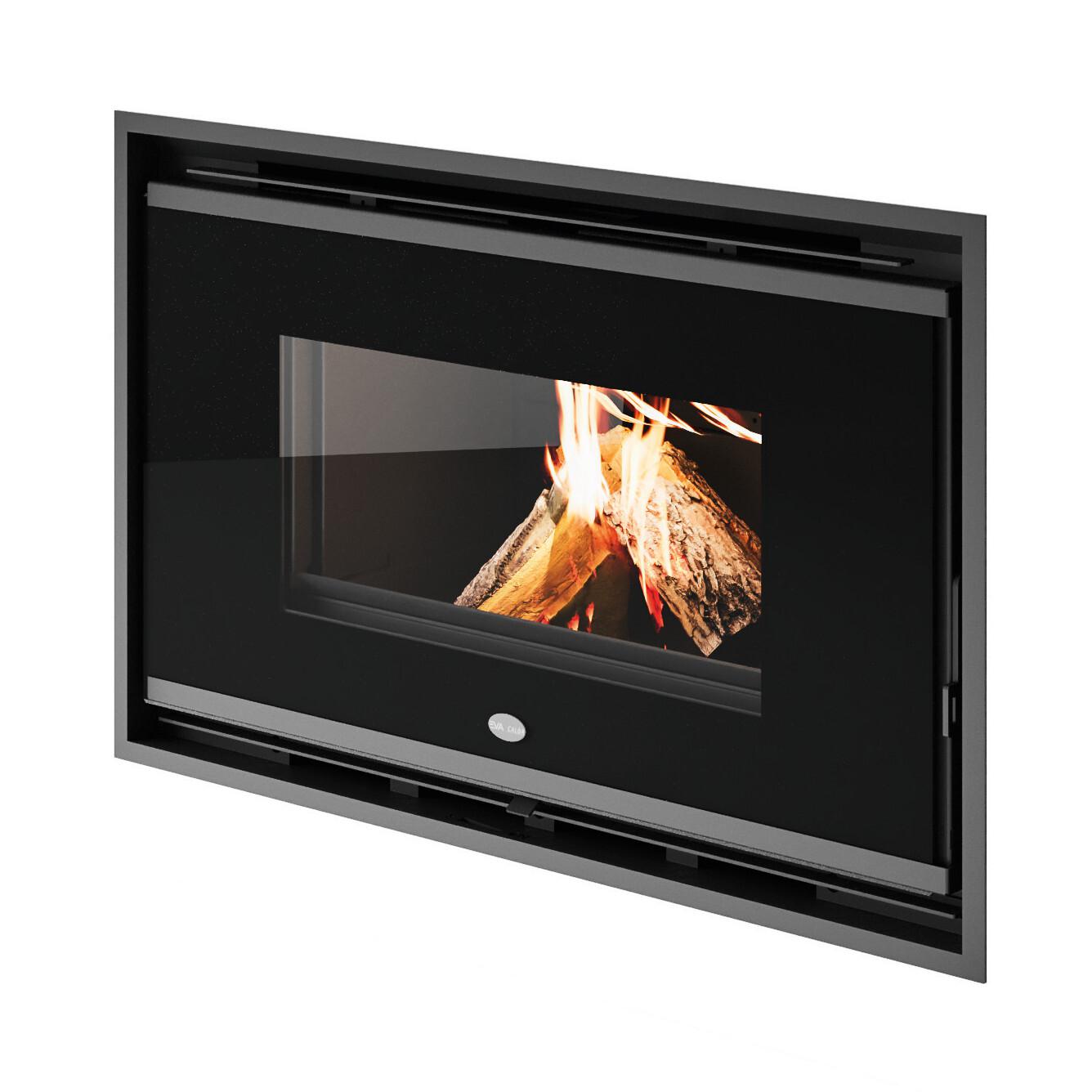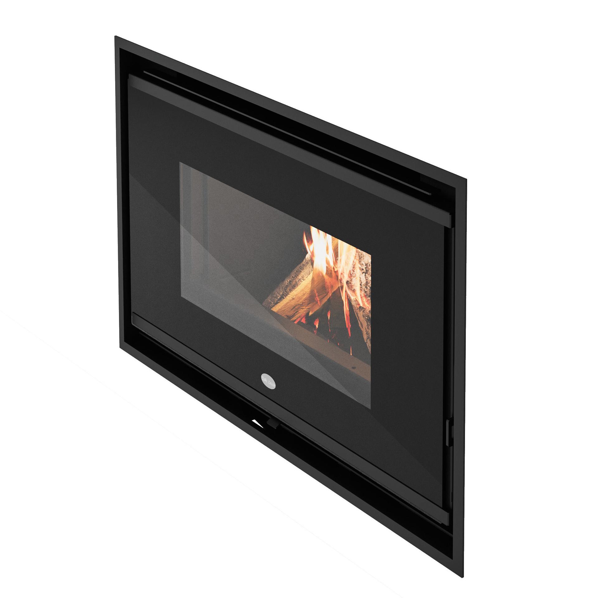 Kamin na drva z zgorevalno komoro iz vermikulita. Linearna zasnova s sprednjimi steklenimi vrati s črnim sitotiskom in odstranljivim ročajem.