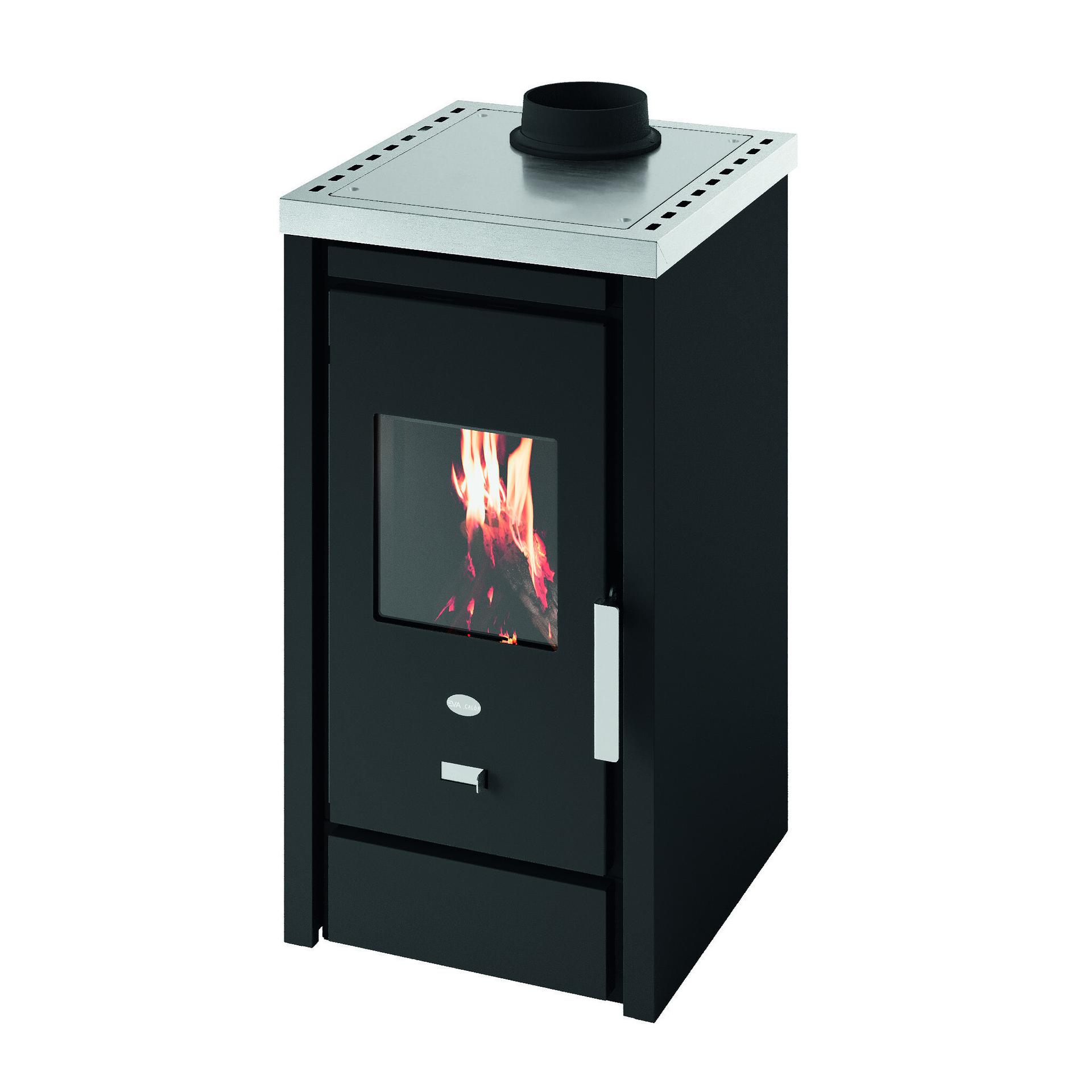 Kompaktni štedilnik z jekleno ploščo za segrevanje jedi. Zgorevalna komora iz vermikulita in regulator dovoda zraka. Odstranljiv predal za pepel za zbiranje pepela v ločenem predelu. Priključek za dimnik na zgornji strani.