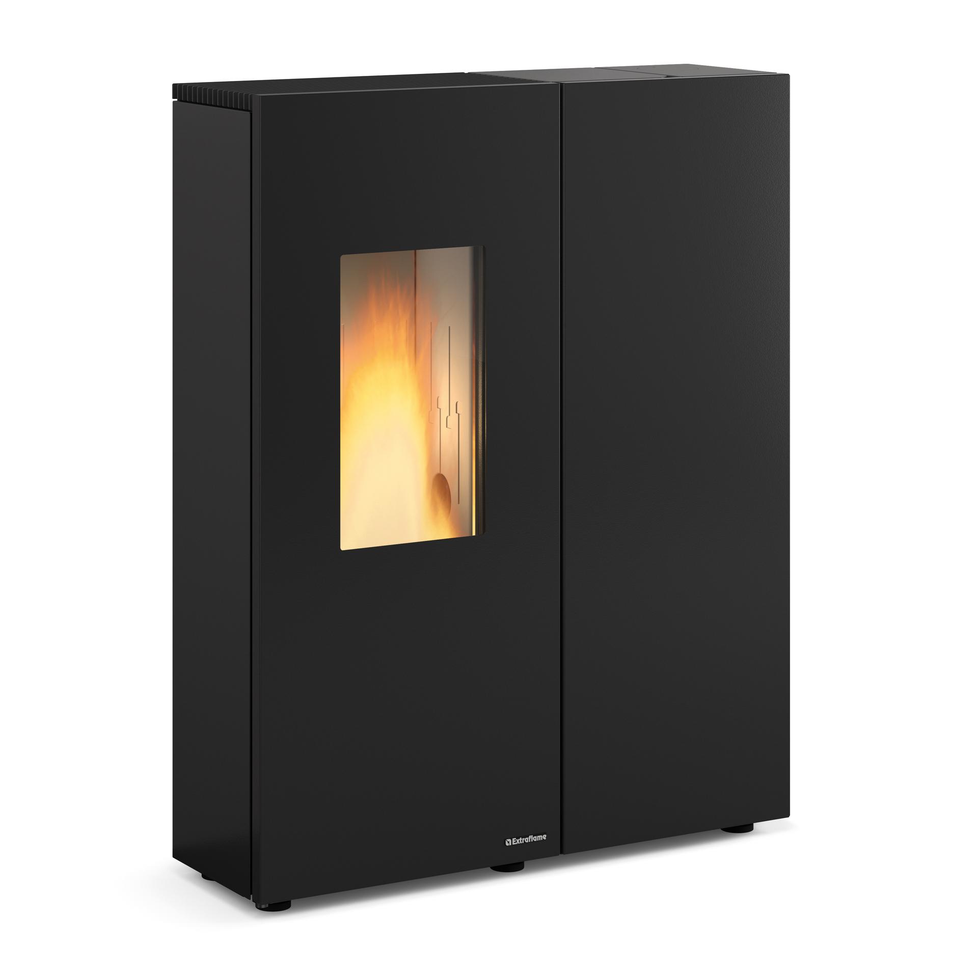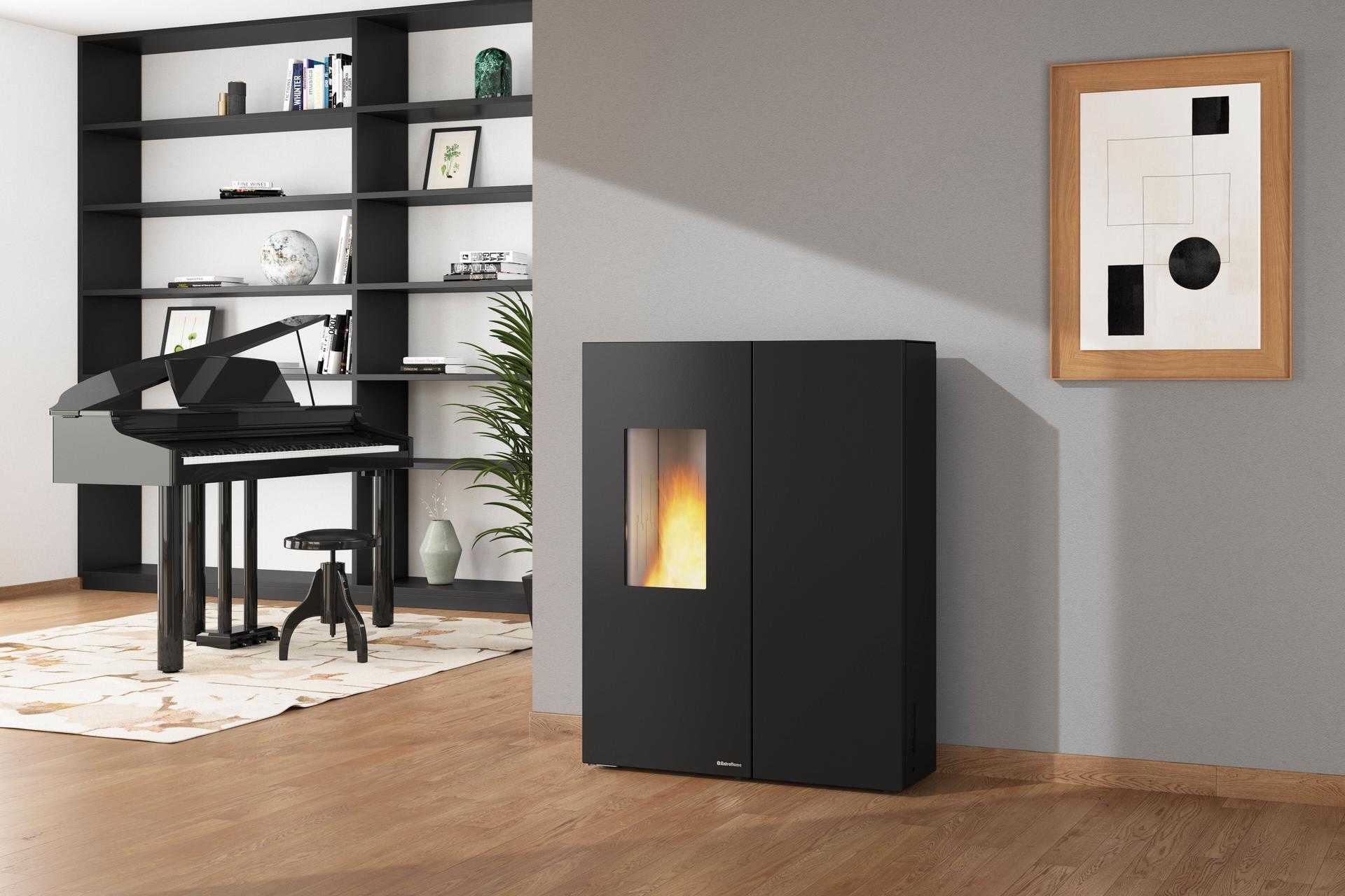 Zrakotesna peč na pelete s sodobnim linearnim dizajnom in dvojnimi vrati, pri čemer so zunanja vrata opremljena s keramičnim steklom. Možnost priključitve dimnika zadaj ali na vrhu olajša namestitev peči.