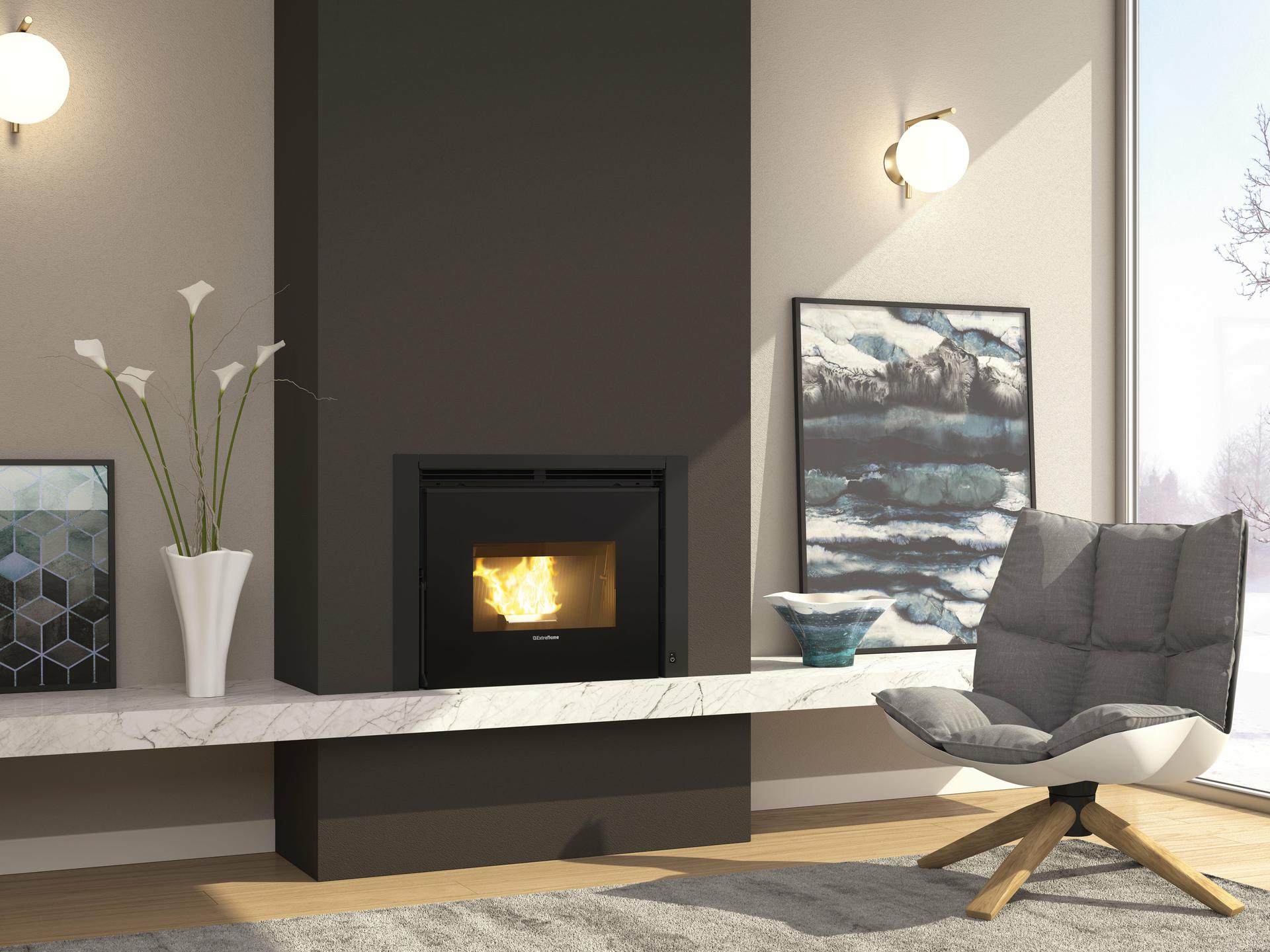 Ventilatorski vložek na pelete z litoželeznimi vrati, kuriščem in žerjavico. Prostorski ventilator, ki ga uravnava sistem Pro Air Setup s tihim, rednim in pospeševalnim načinom. Senzor za nivo peletov obvesti uporabnika, ko je treba rezervoar za pelete napolniti.