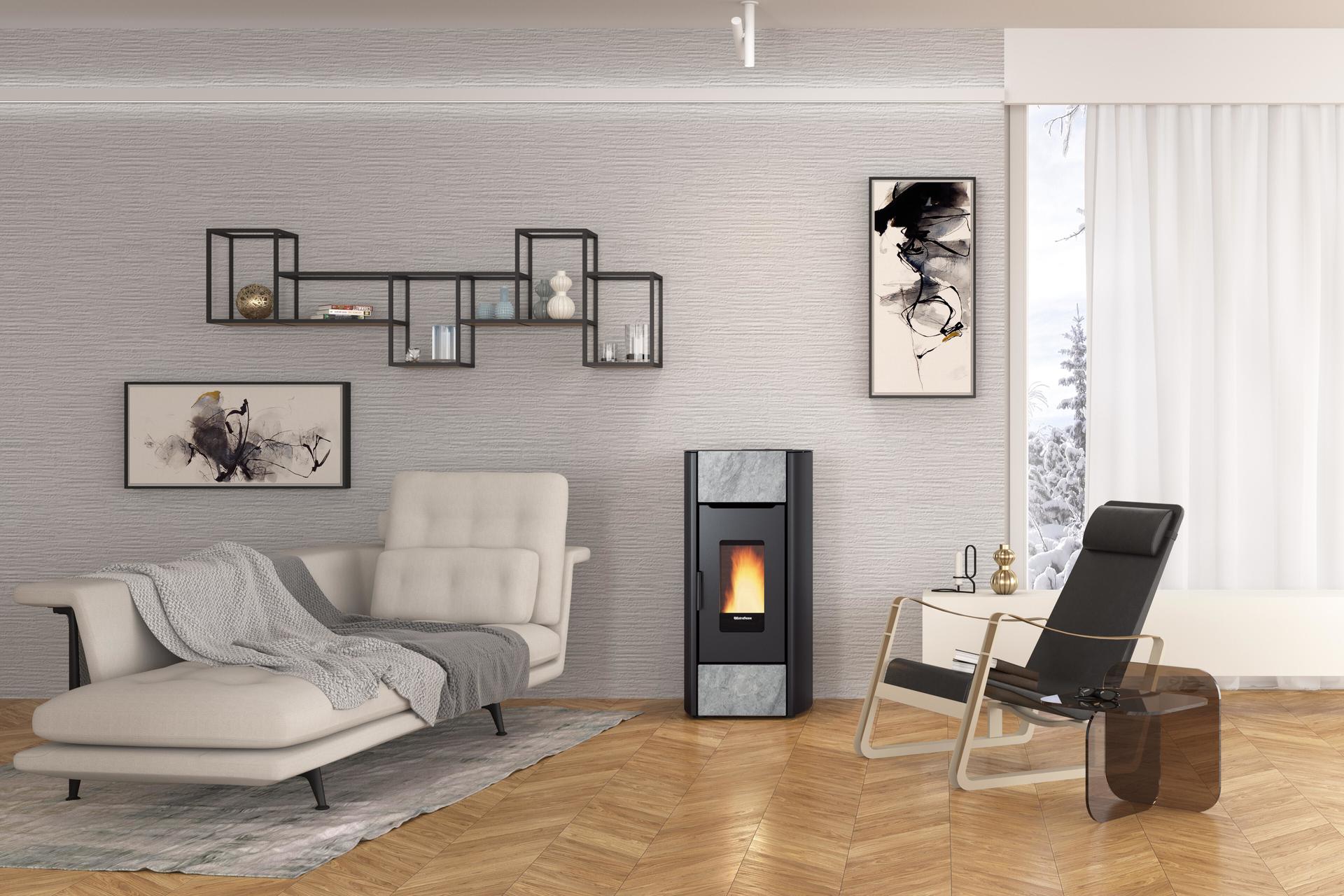 La Nordica Extraflame Mirka Plus je peč z zaobljenimi robovi in linearnim dizajnom, ki vključuje sprednje elemente iz naravnega kamna in tako zagotavlja prepoznaven dizajn. Če upoštevamo tudi možnosti odvoda dima, ki je lahko zadaj ali zgoraj, je to peč na pelete enostavno postaviti v prostor.