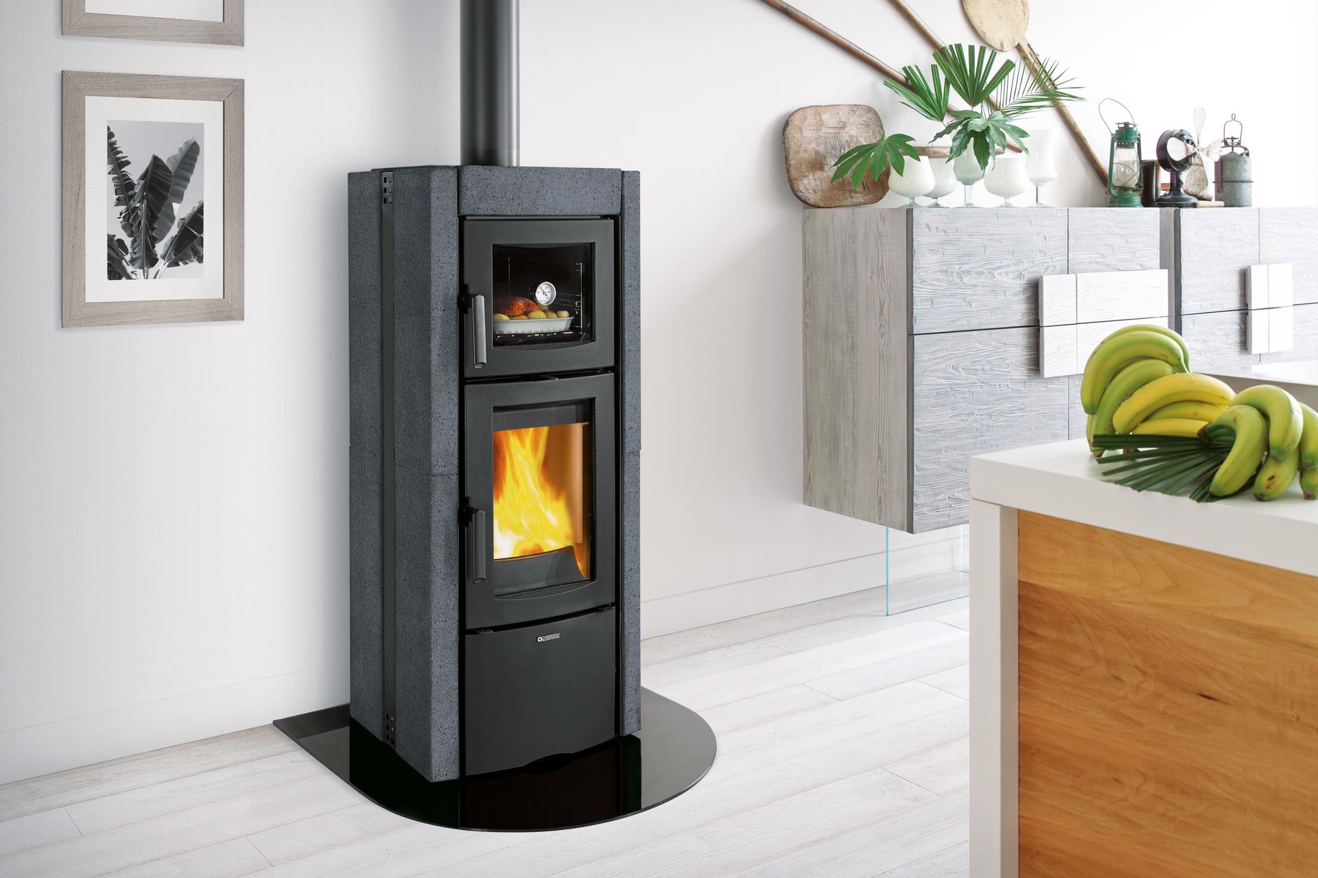 Peč na drva z zunanjo oblogo iz kamna vulcan in pečico iz porcelanasto emajliranega jekla. Vrata kurišča, zgornji del, podstavek in okvir so iz emajliranega litega železa. Notranja obloga kurišča je iz litega železa. Keramično steklo omogoča širok pogled na ogenj.