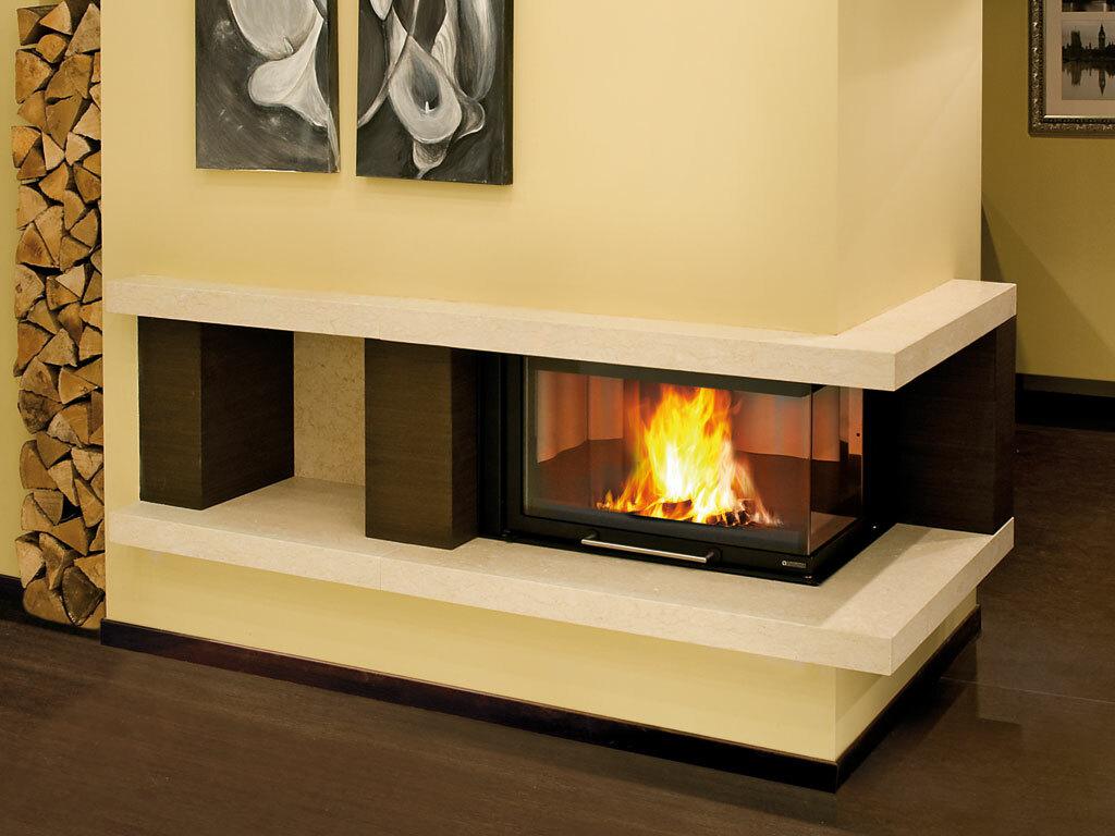 Kotni monoblok za kamine s kotnim keramičnim steklom v enem kosu. Dvižna drsna vrata na tihih teleskopskih drsnikih. Notranja obloga ognjišča iz litega železa in Nordikerja. Konstrukcija, kurišče in rešetka iz litega železa. Posebna jeklena kapa debeline 3 mm.