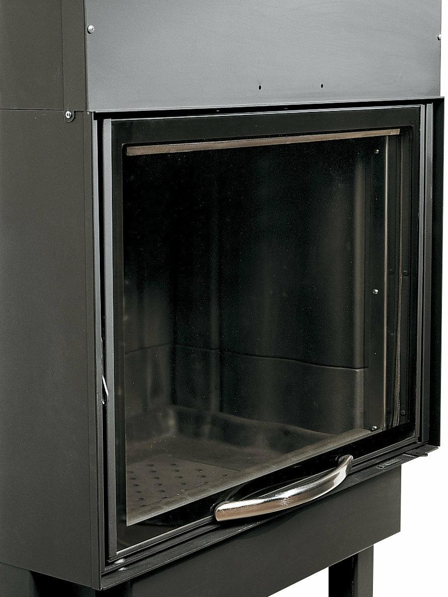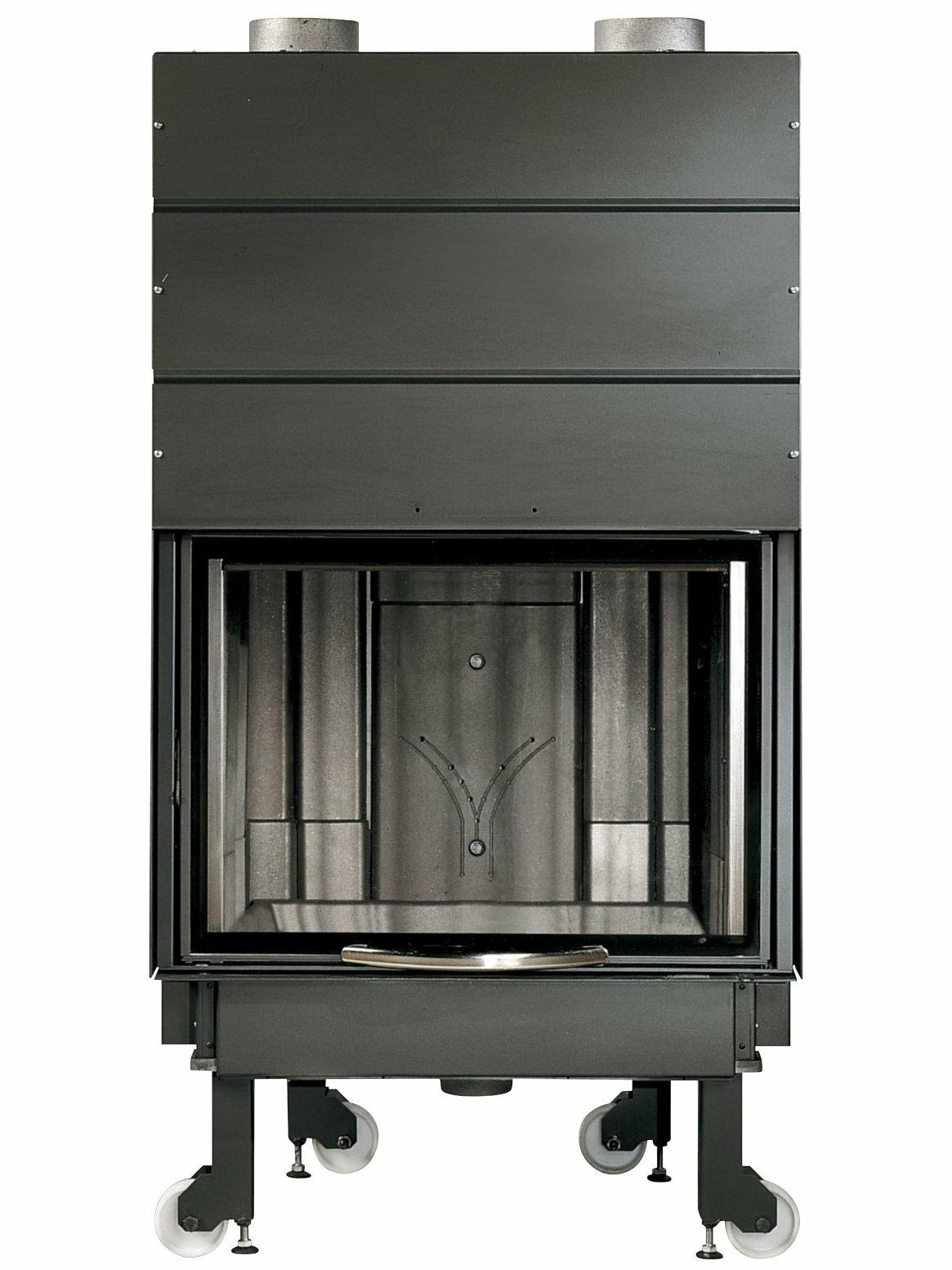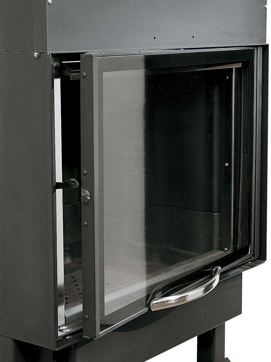 Monoblok na drva z dvižnimi drsnimi vrati na tihih teleskopskih drsnikih. Keramično steklo. Izvlečni predal za pepel. Notranja obloga kurišča, konstrukcija, kurišče in rešetka iz litega železa.