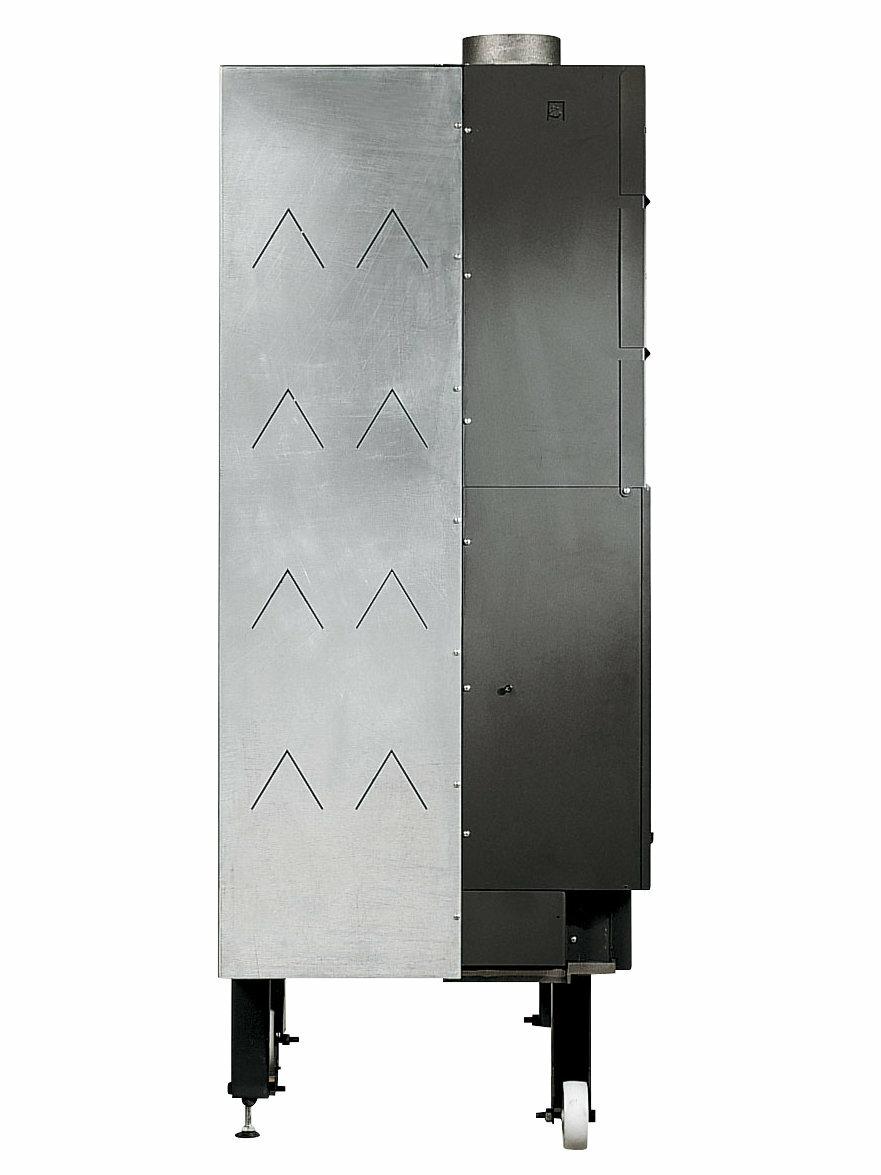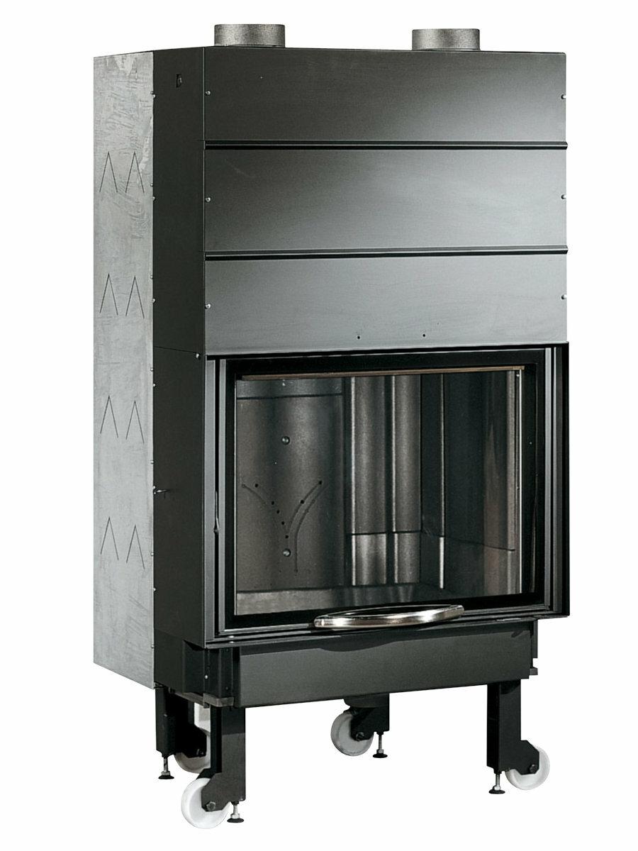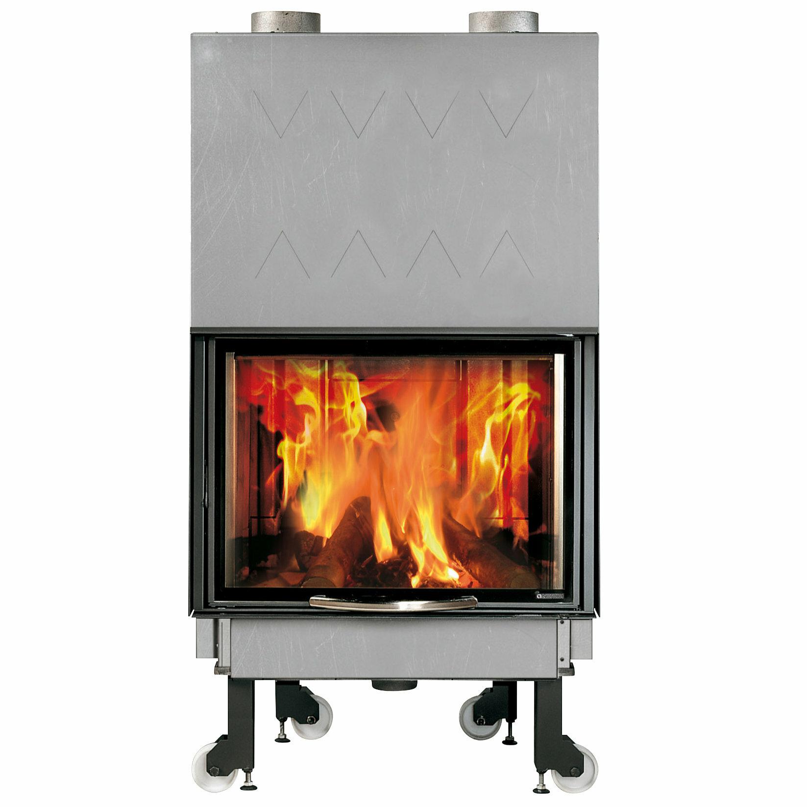 Monoblok na drva z dvižnimi drsnimi vrati na tihih teleskopskih drsnikih. Keramično steklo. Izvlečni predal za pepel. Notranja obloga kurišča, konstrukcija, kurišče in rešetka iz litega železa.