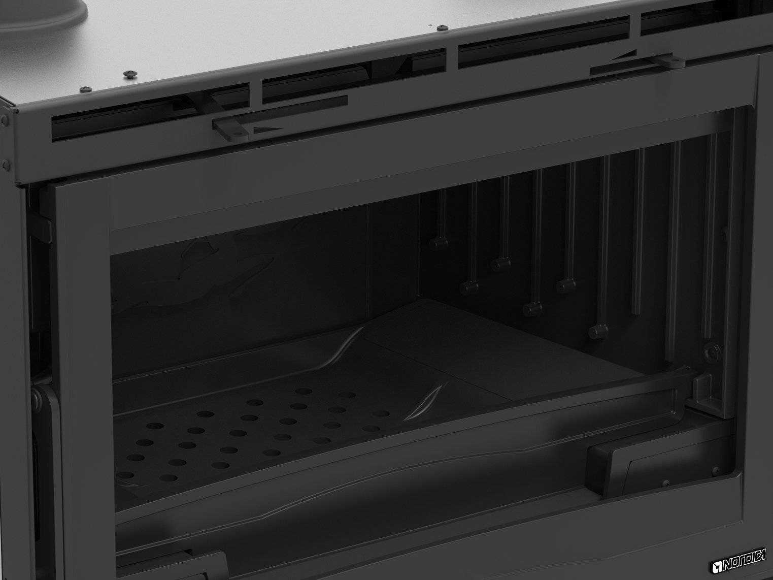 Ventilatorski vložek na drva z minimalno višino. Dva tangencialna ventilatorja za čelni vpih toplega zraka. Notranja obloga kurišča iz litega železa in Nordikerja. Vrata kurišča in konstrukcija iz litega železa. Keramično steklo. Nastavljiv primarni in sekundarni zrak za boljši nadzor zgorevanja s sistemom naknadnega zgorevanja za nizke emisije.