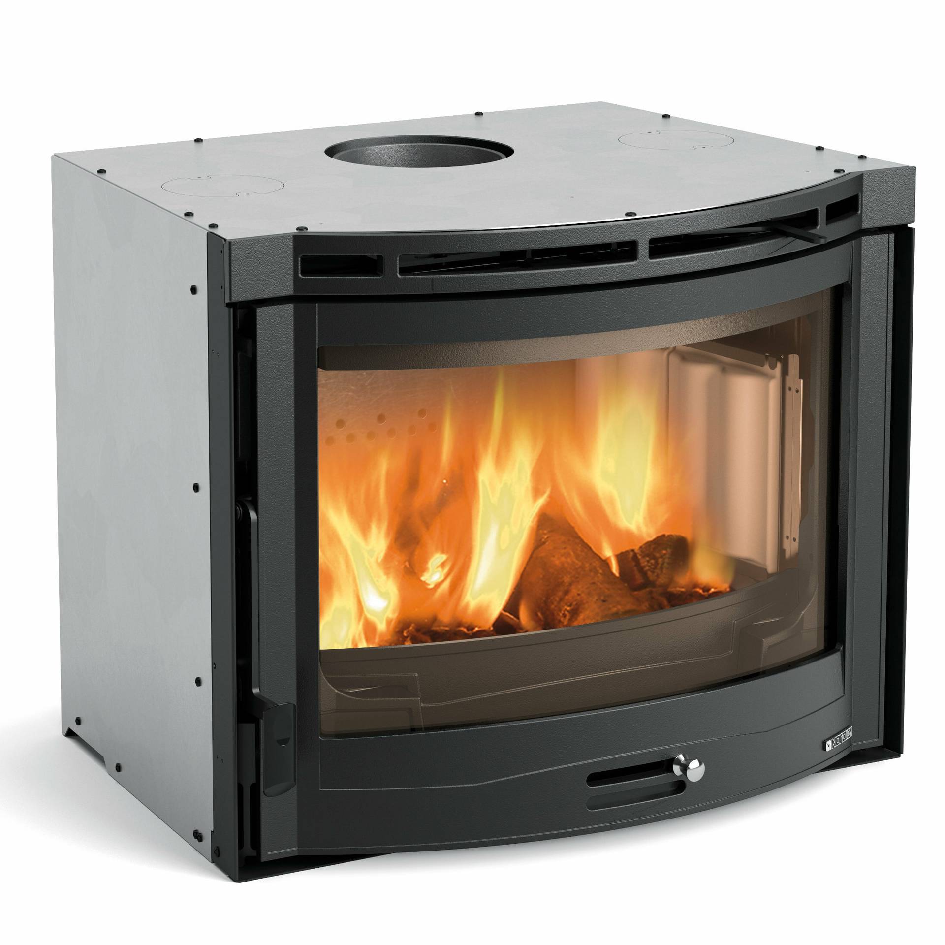 Ventilatorski vložek na drva z ukrivljenim keramičnim steklom. Dva tangencialna ventilatorja. Notranja obloga kurišča iz litega železa in Nordikerja. Vrata kurišča in konstrukcija iz litega železa. Nastavljiv primarni in sekundarni zrak za boljši nadzor zgorevanja s sistemom naknadnega zgorevanja za nizke emisije.