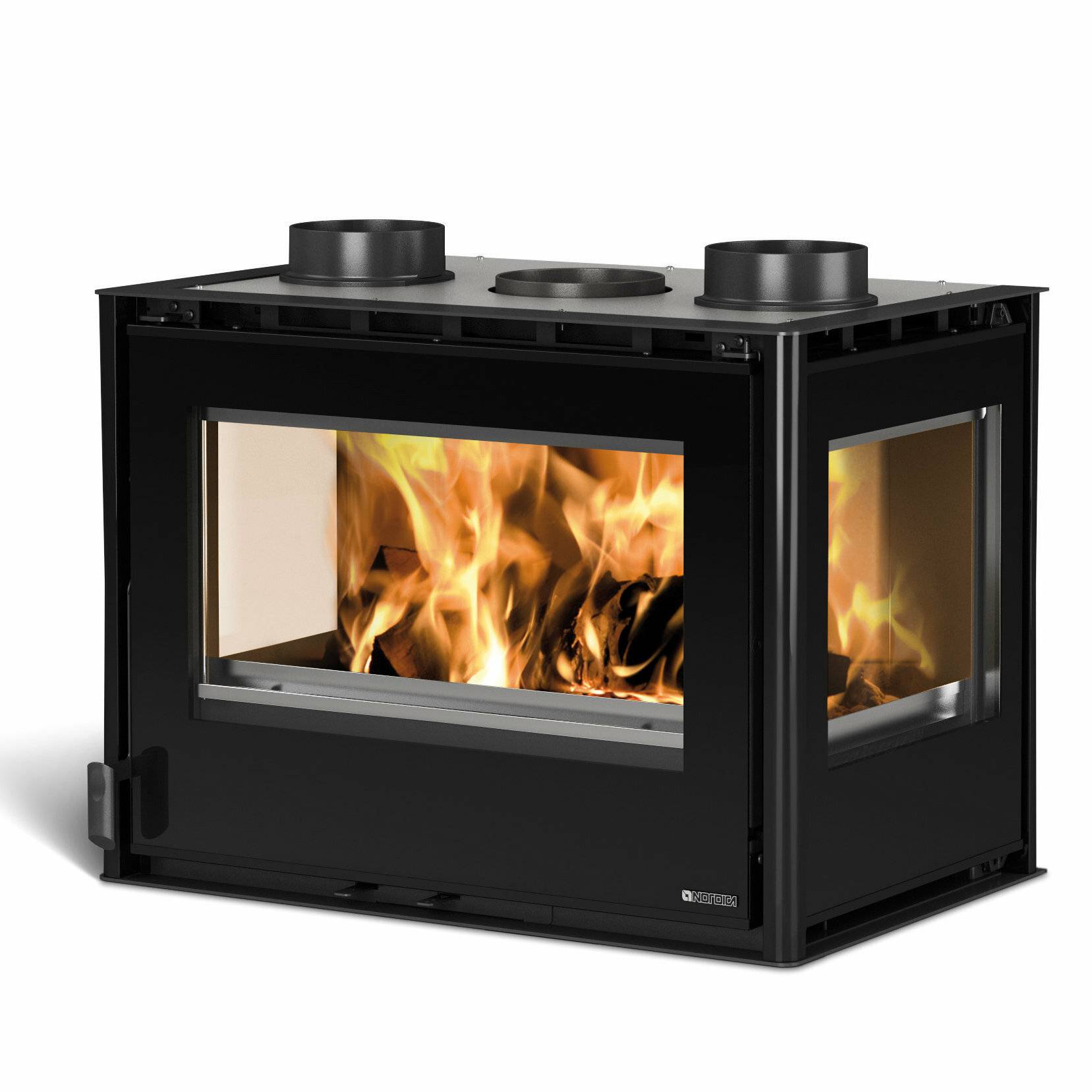Kaminski vložek na drva s panoramskim pogledom na ogenj s treh strani. Notranja obloga kurišča iz litega železa in Nordikerja. Obračljiva ognjevarna vrata in konstrukcija iz litega železa. Keramično steklo. Nastavljiv primarni in sekundarni zrak za boljši nadzor zgorevanja s sistemom naknadnega zgorevanja za nizke emisije.