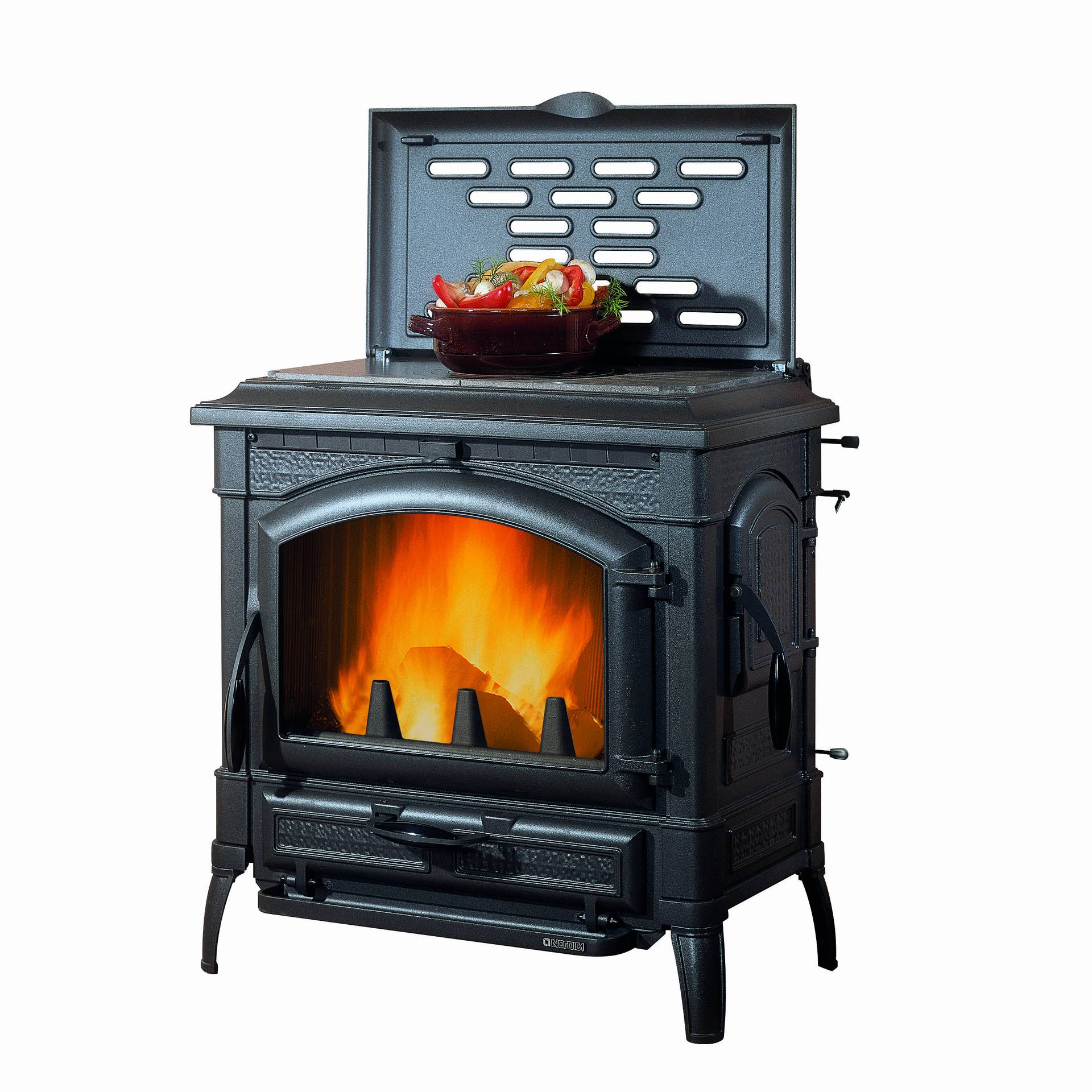 Peč na drva s strukturo iz emajliranega litega železa. Kuhalna plošča in obroči iz poliranega litega železa. Sprednja in stranska vrata za nalaganje polen.