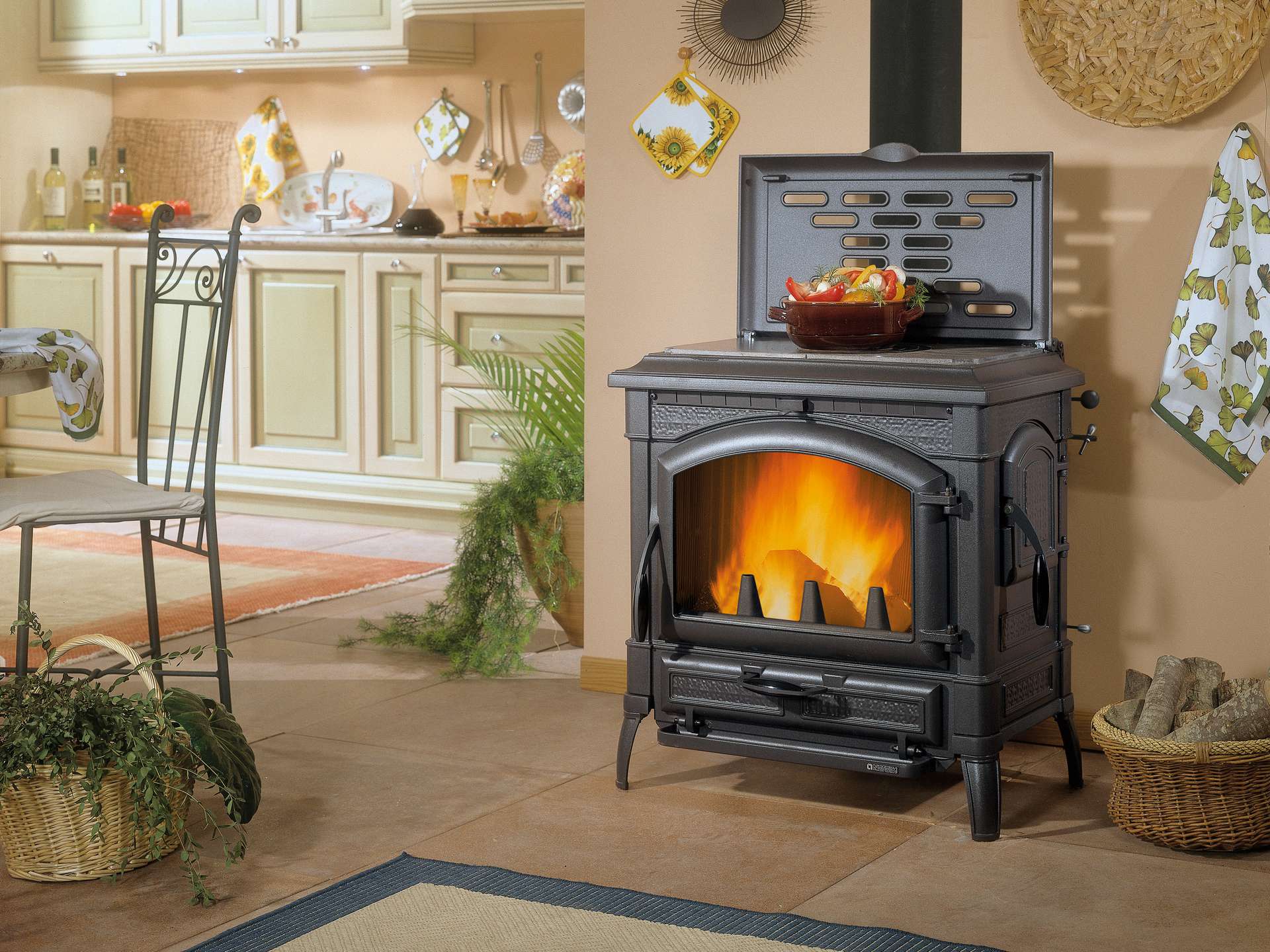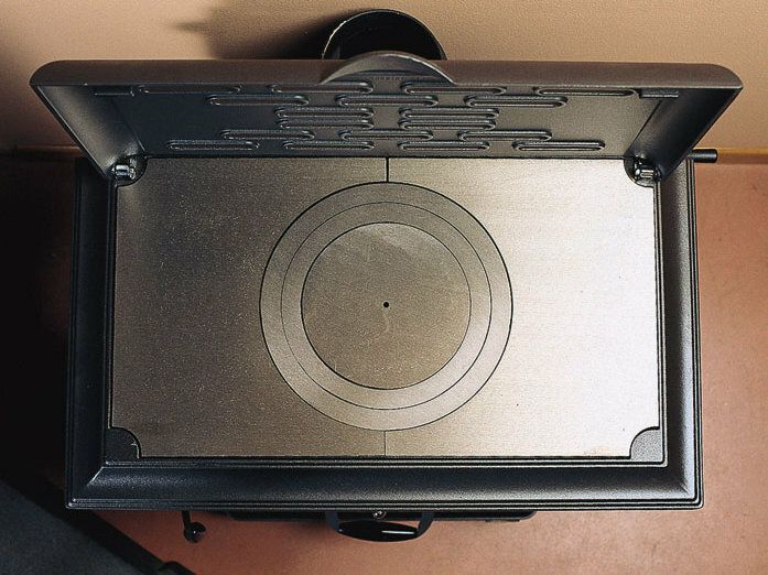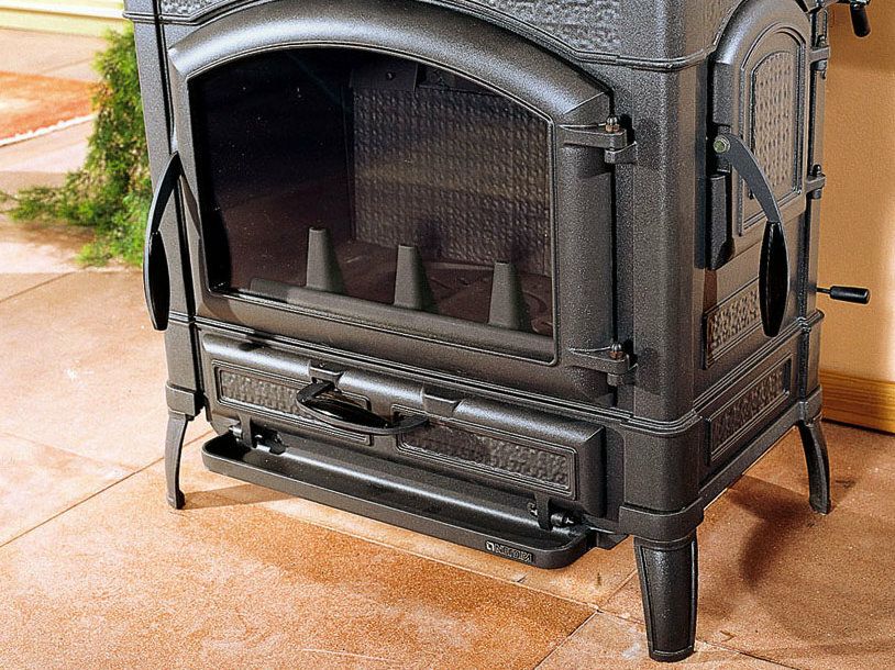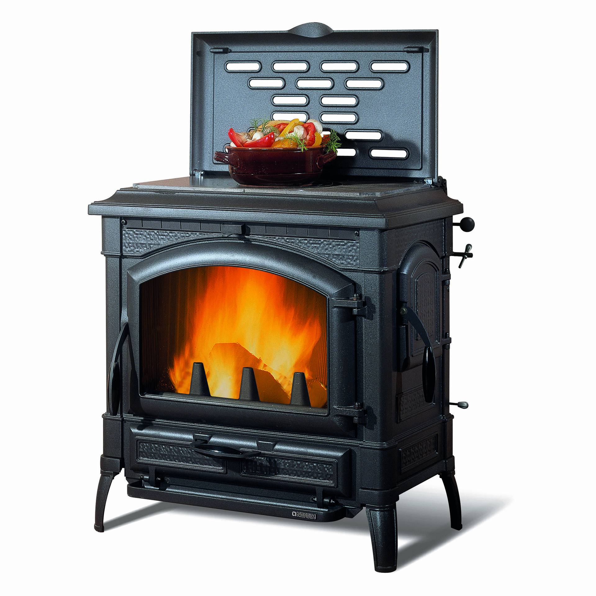 Peč na drva s strukturo iz emajliranega litega železa. Kuhalna plošča in obroči iz poliranega litega železa. Sprednja in stranska vrata za nalaganje polen.