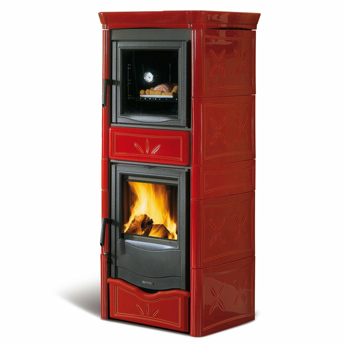 Termo peč na drva s pečico iz porcelanasto emajliranega jekla, varnostno napravo DSA (ventil DSA ni vključen) in ročno izdelano oblogo iz majolike. Notranja obloga kurišča iz litega železa in jekla. Emajlirana vrata iz litega železa s keramičnim steklom. Zračni termostatski ventil.