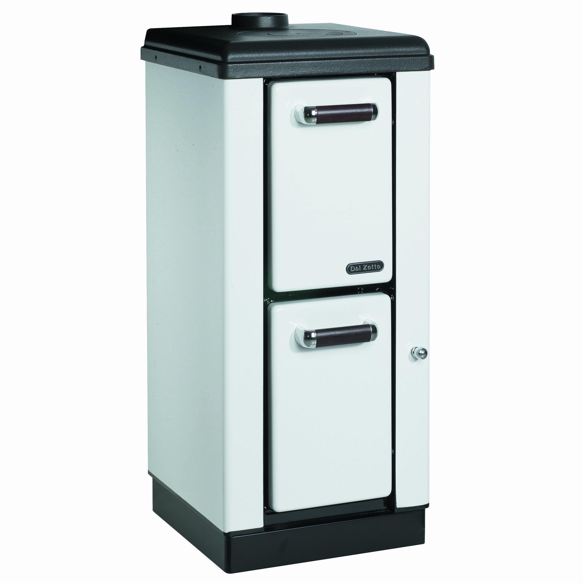 Peč na drva s porcelanasto emajlirano jekleno oblogo. Leseni ročaji, kromiran zaključek in kuhalna plošča iz emajliranega litega železa.