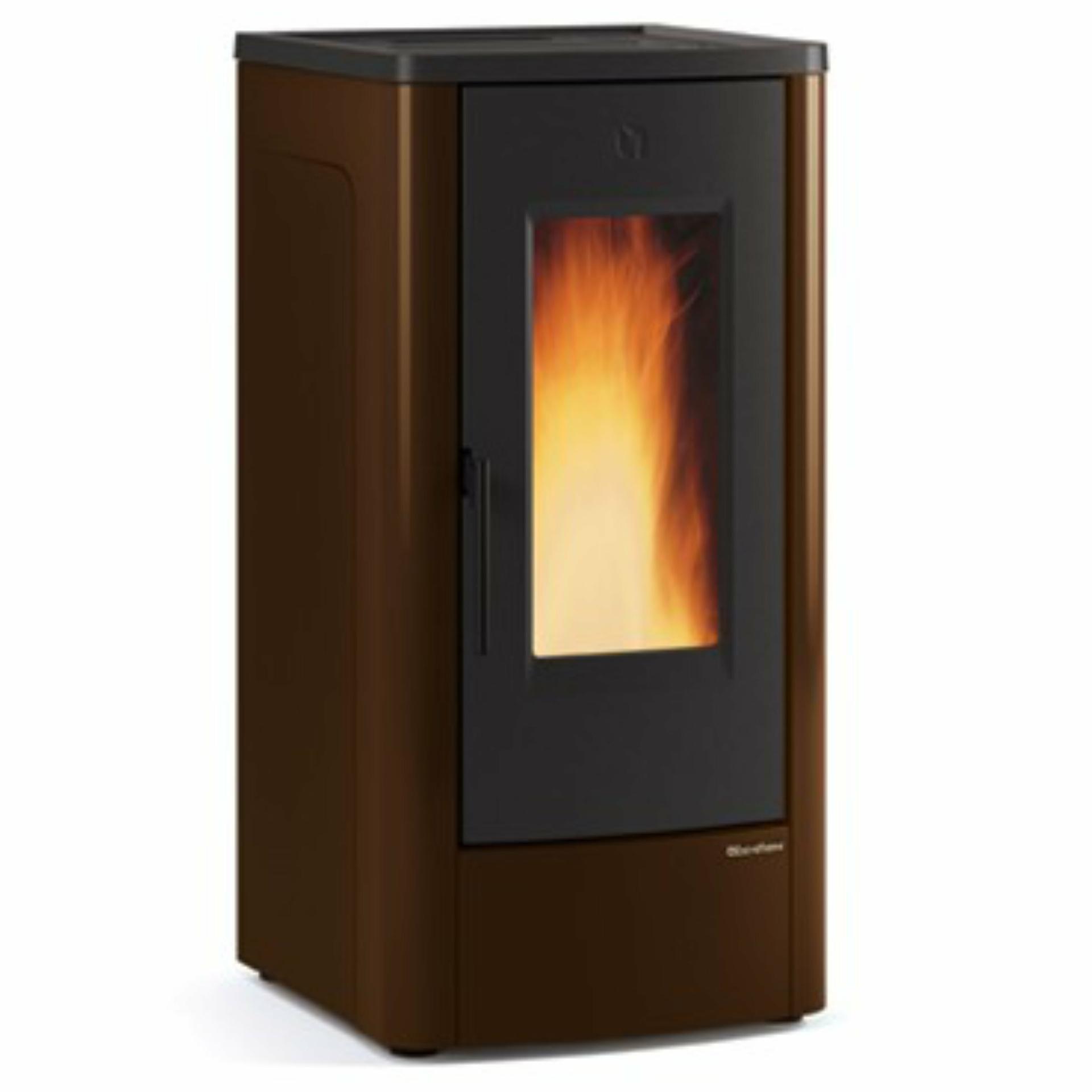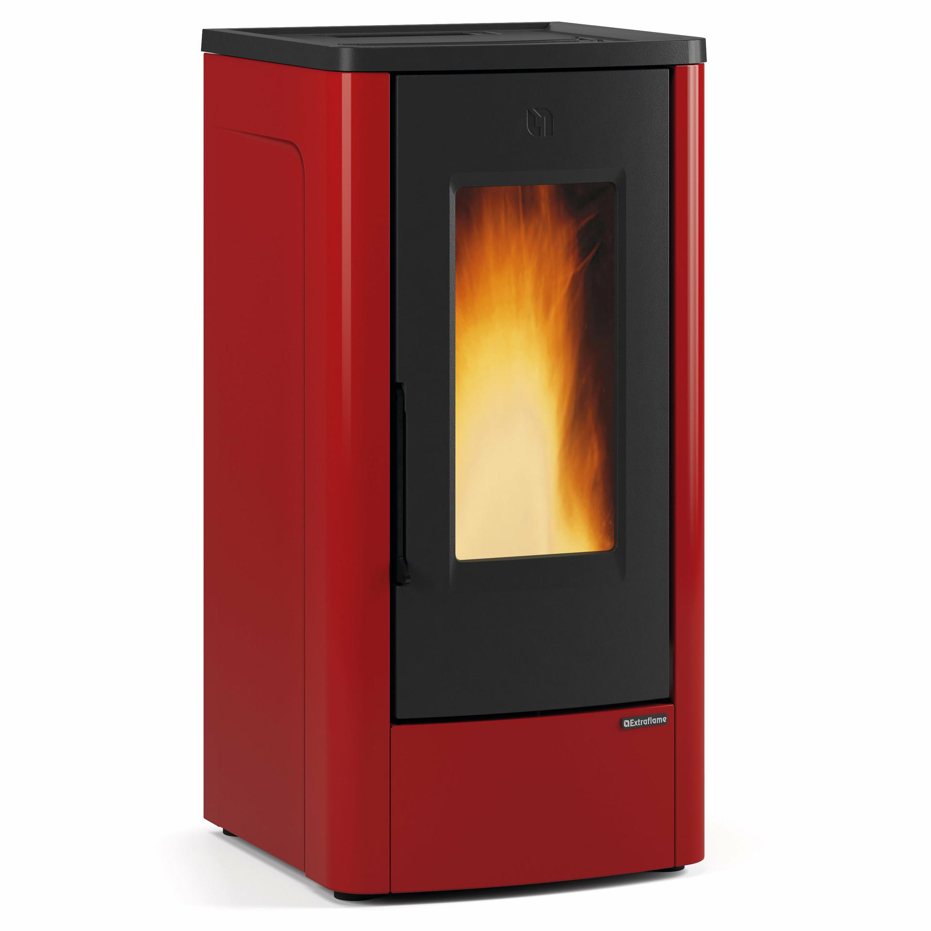 Ventilatorska kaminska peč na pelete z velikim zalogovnikom za pelete. Čelni vpih toplega zraka z namenskim motorjem, s funkcijo Comfort. Širok pogled na ogenj.