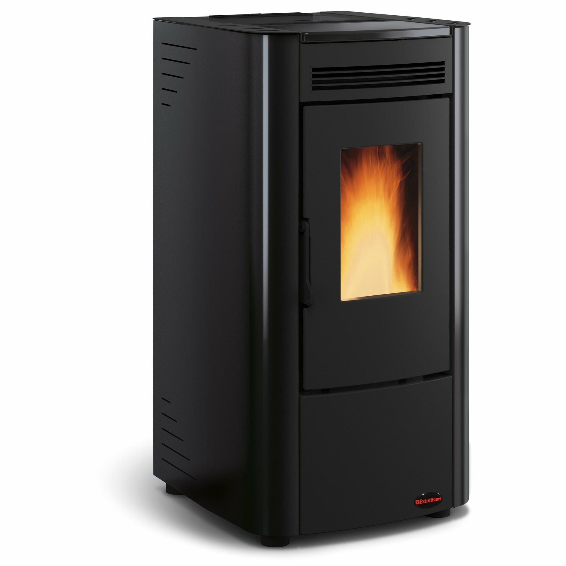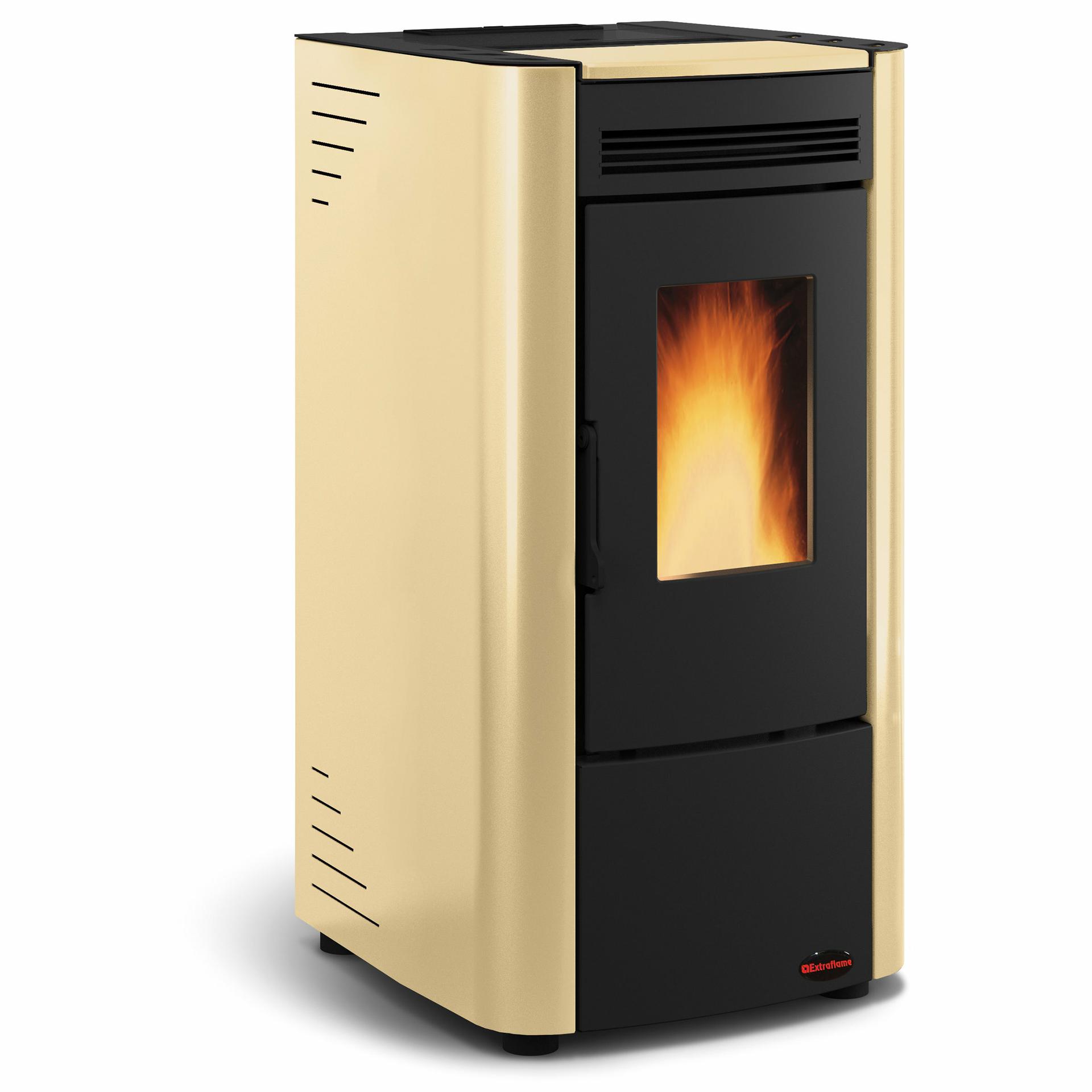 Kaminska peč na pelete z ventilacijo in sevalnim površinskim toplotnim izmenjevalnikom. Kurišče, vrata kurišča in posoda kurišča iz litega železa.