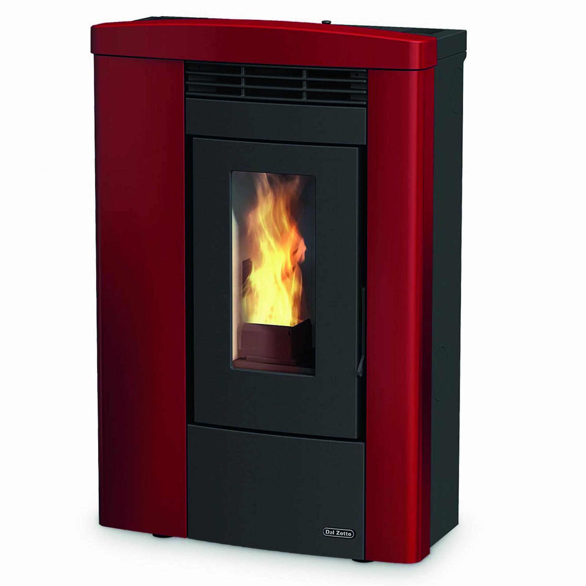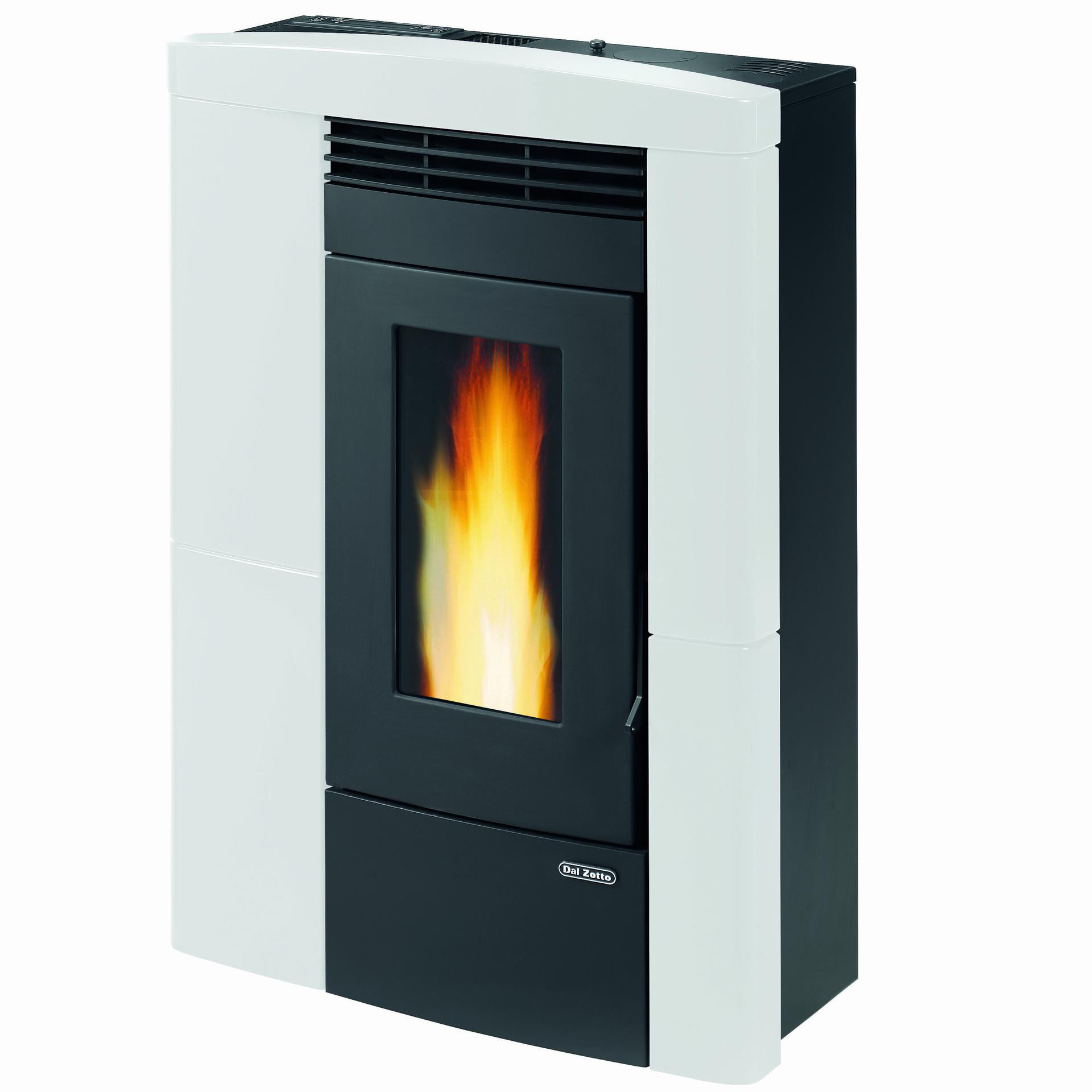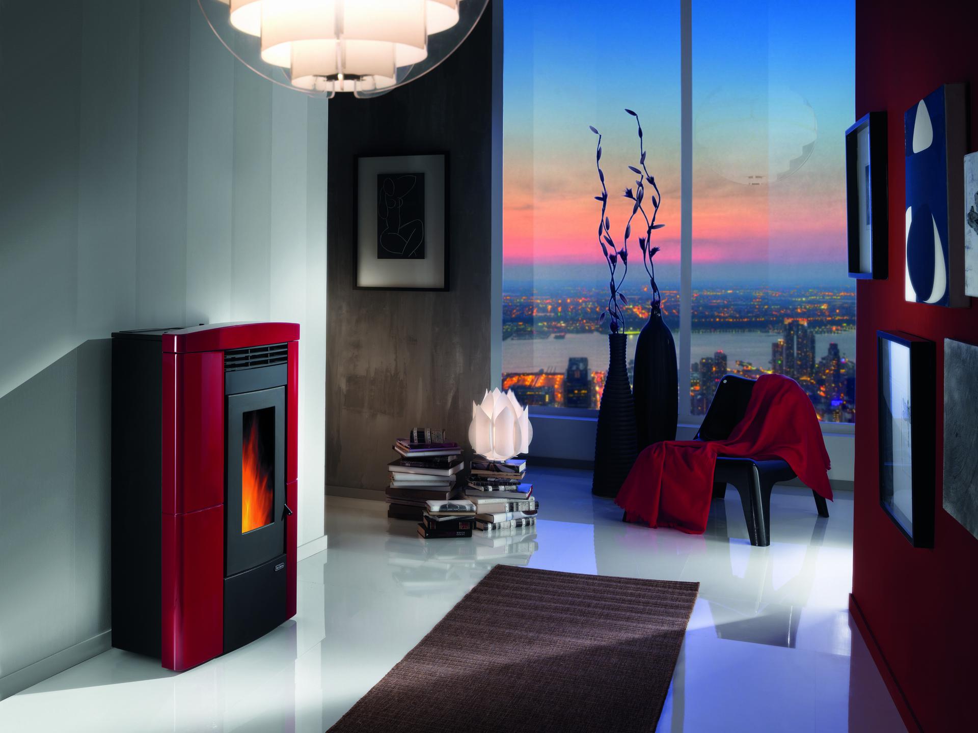 Peč na pelete z zunanjo oblogo iz majolike in keramičnim steklom za pogled na ogenj. Tedenski daljinski upravljalnik in termostat. Dimniški priključek na zadnji, zgornji ali desni strani.