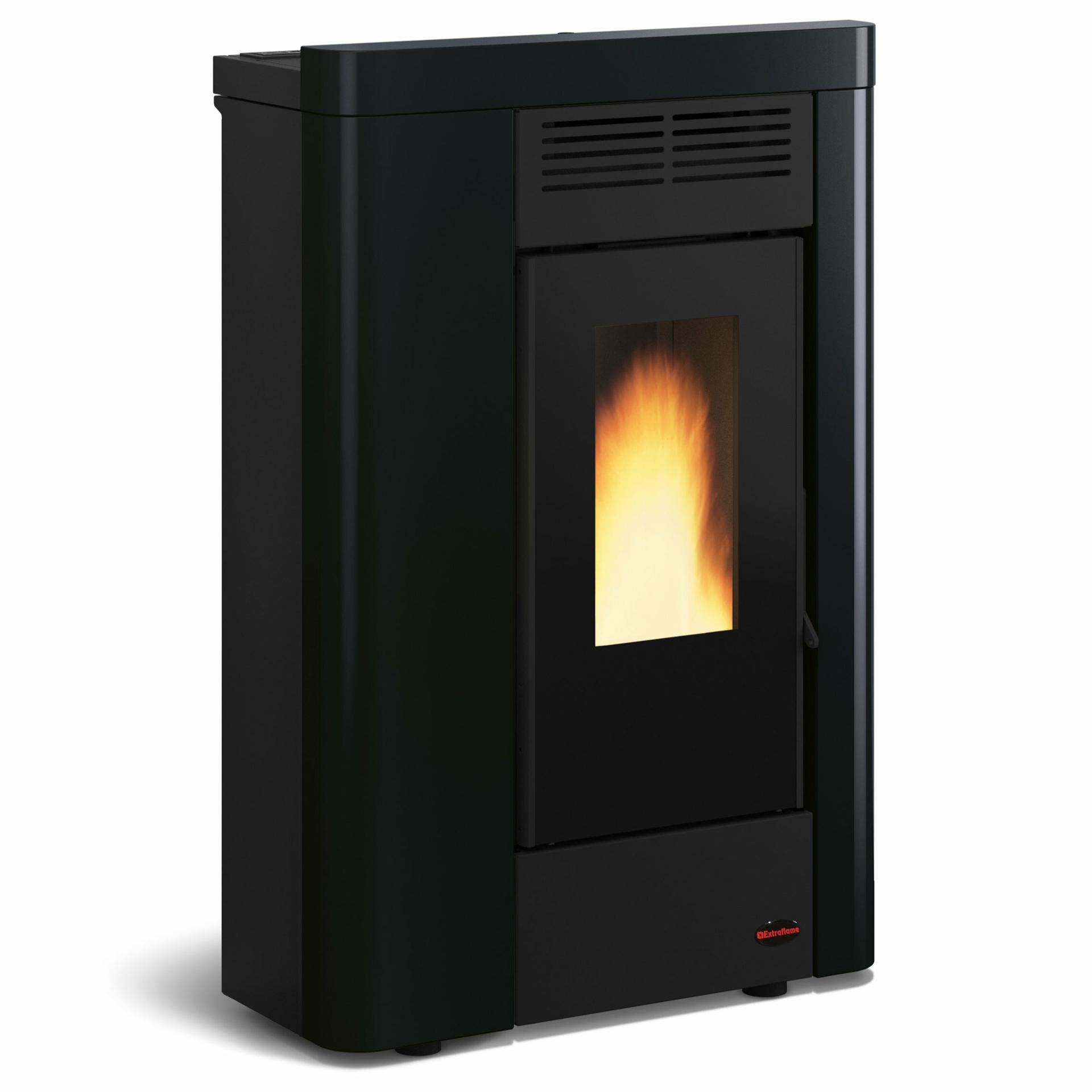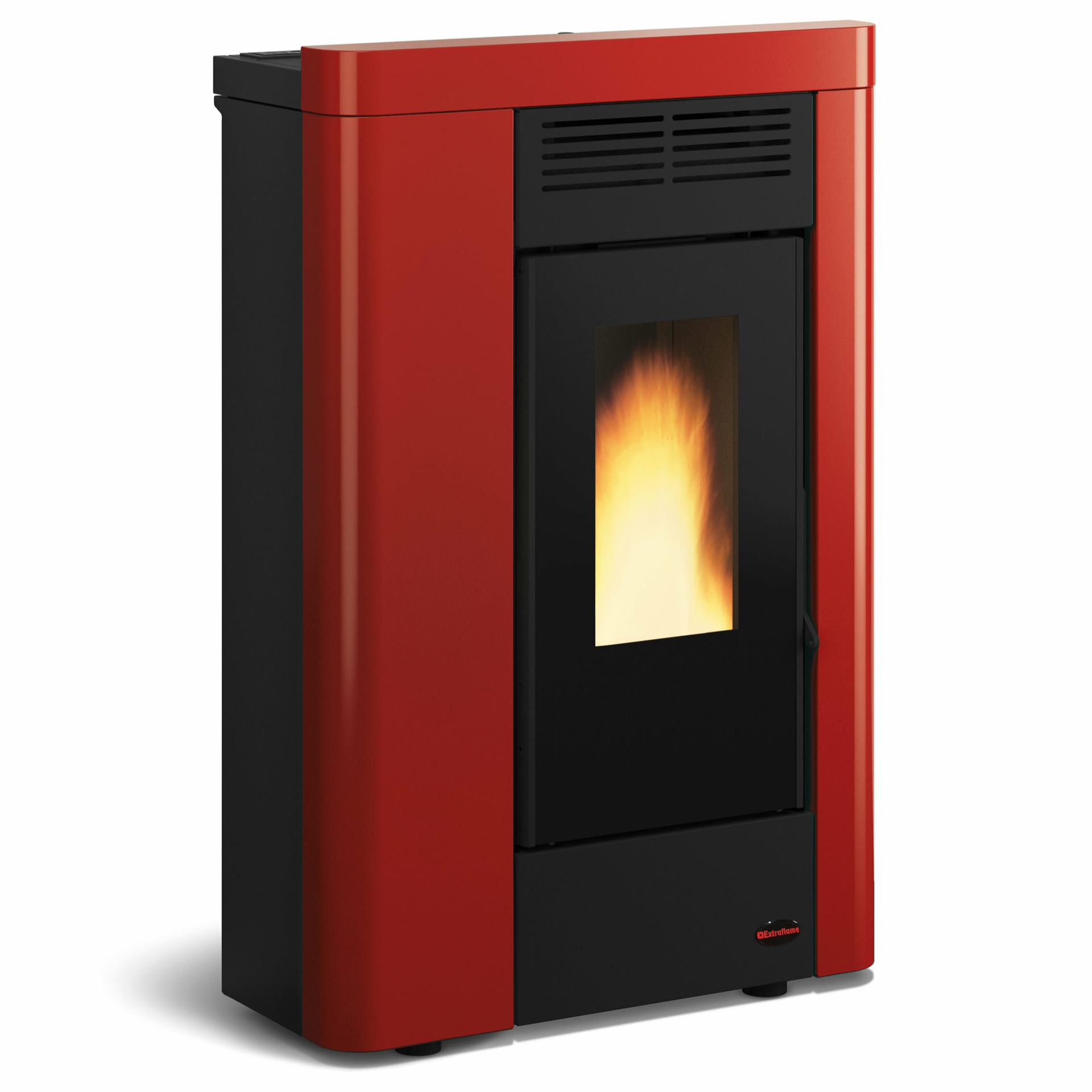 Kaminska peč na pelete s priklopom na razvod toplega zraka iz lakiranega jekla z daljinskim upravljalnikom in tedenskim nastavljivim termostatom.