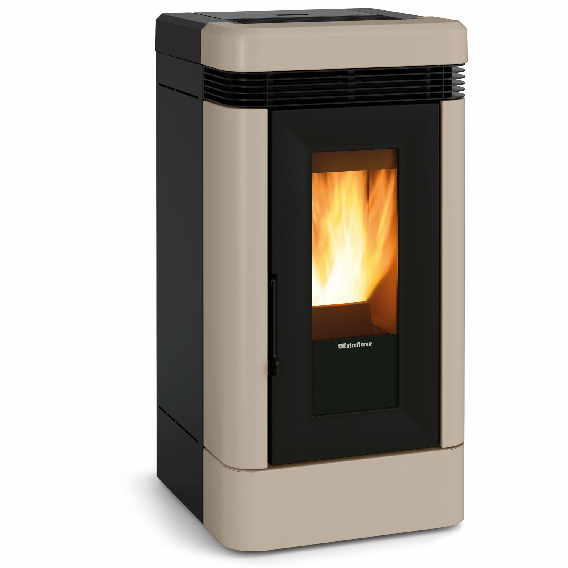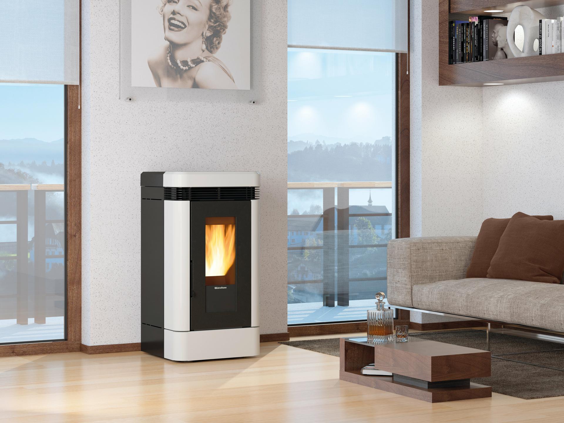 Kaminska peč na pelete z dvojnim cevnim razvodom z dvema namenskima motorjema z zmogljivostjo razdalje vpiha do 8 m, z možnostjo nastavitve termostata in izklopa.