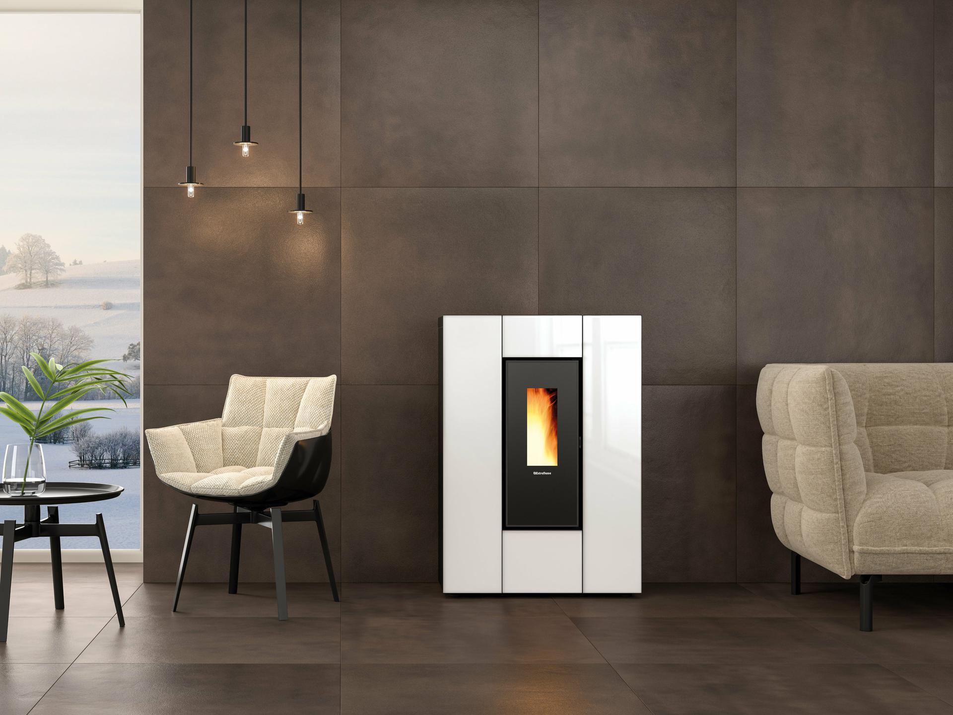 Kompaktna peč na pelete s stekleno prevleko. Sistem kanalov z namenskim motorjem do 8 m, z možnostjo termostata in izključitve. Kurišče, vrata kurišča in posoda kurišča iz litega železa.