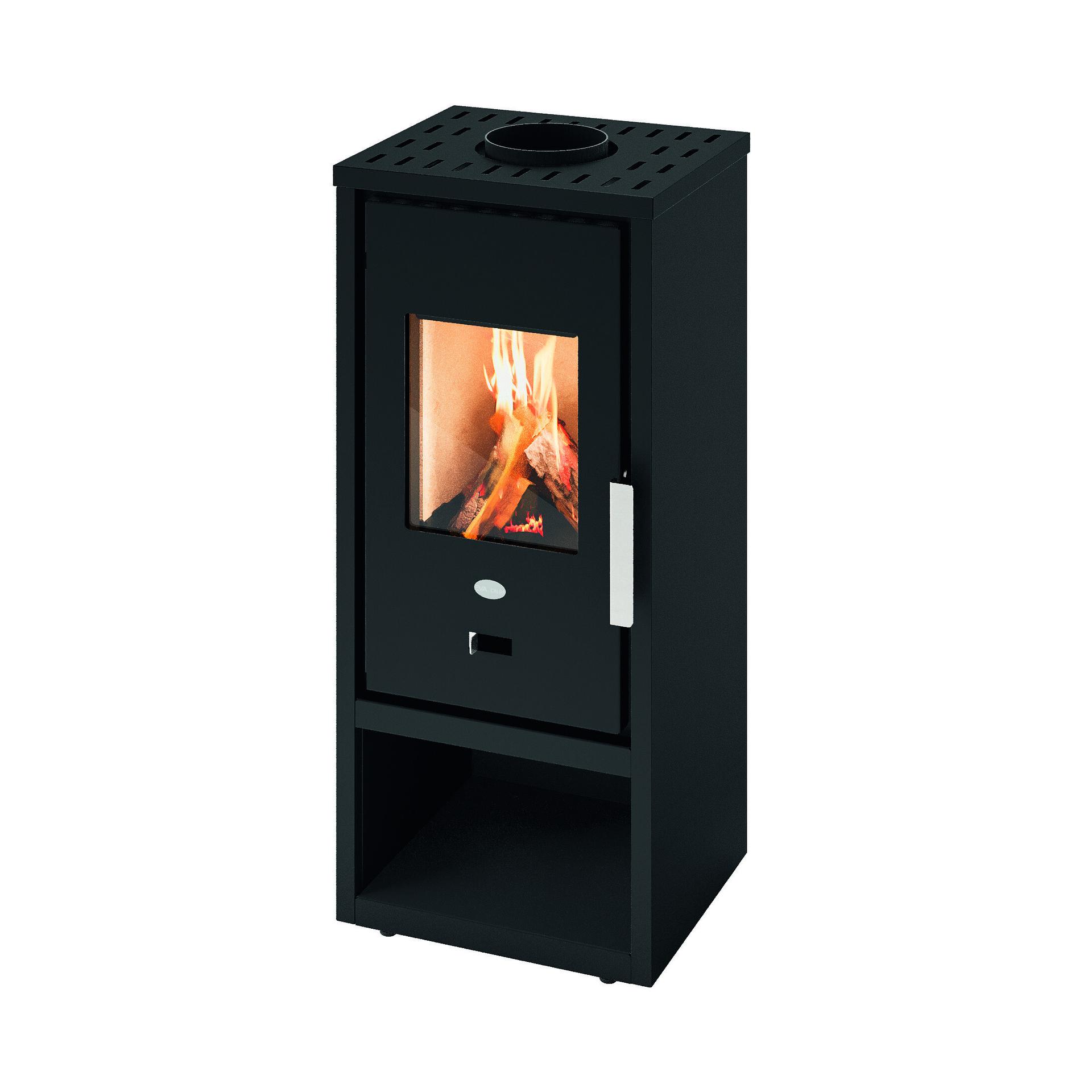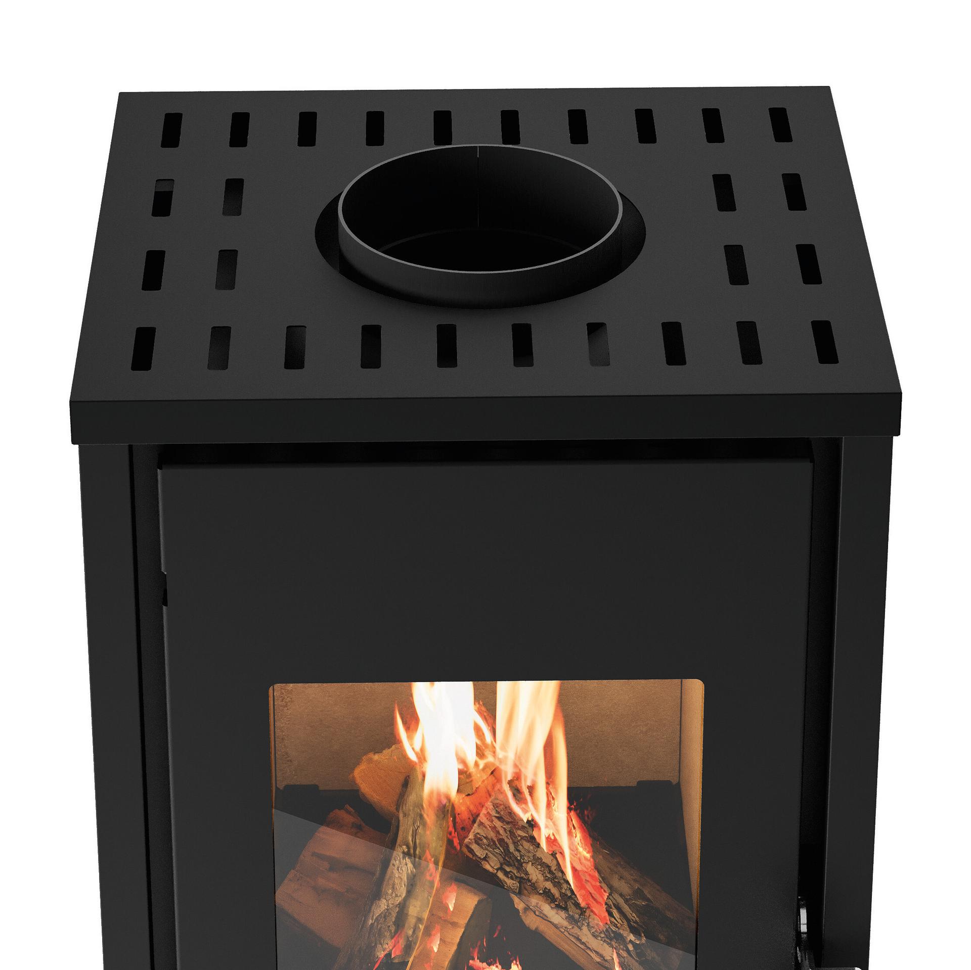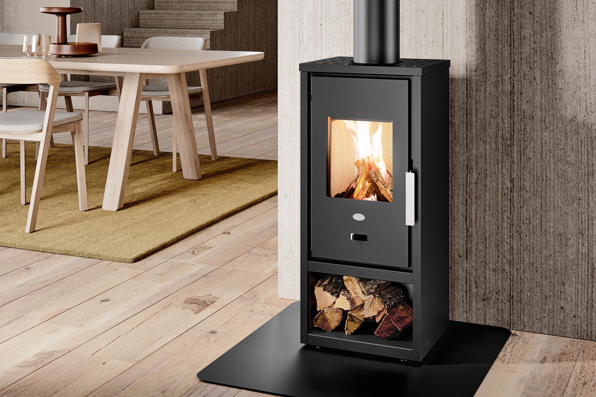 Kompaktna in esencialna zasnova z jeklenim ohišjem in predalom za drva. Zgorevalna komora iz vermikulita in regulator zgorevalnega zraka. Odstranljiv predal za pepel za zbiranje pepela v ločenem predelu. Priključek za dimnik na zgornjem delu.
