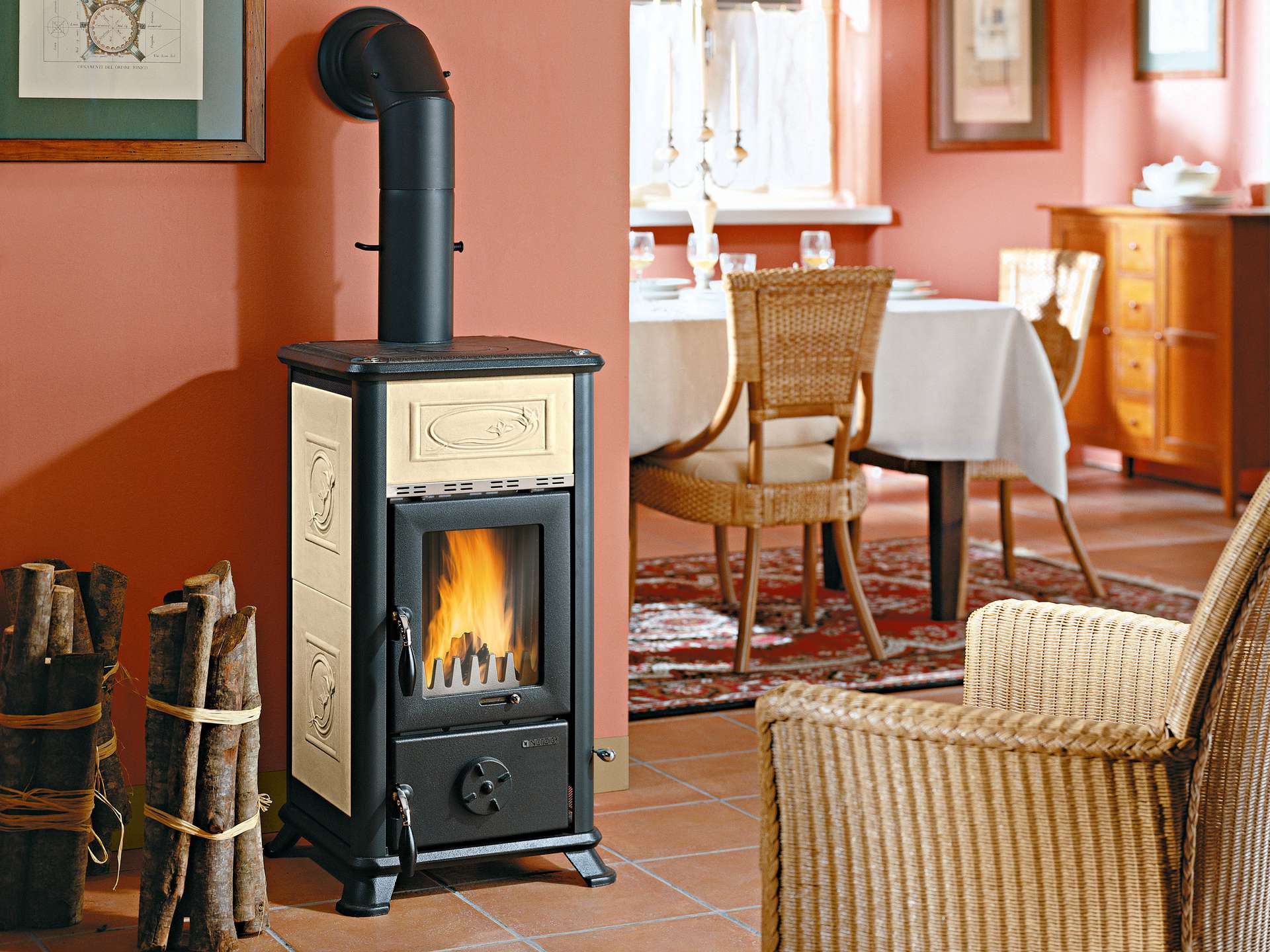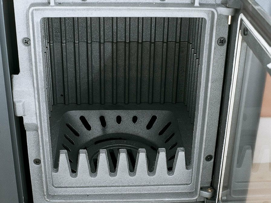 Peč na drva z zunanjo oblogo iz majolike ali naravnega kamna. Vrata in zgornji del ohišja iz emajliranega litega železa. Notranja obloga kurišča iz litega železa.