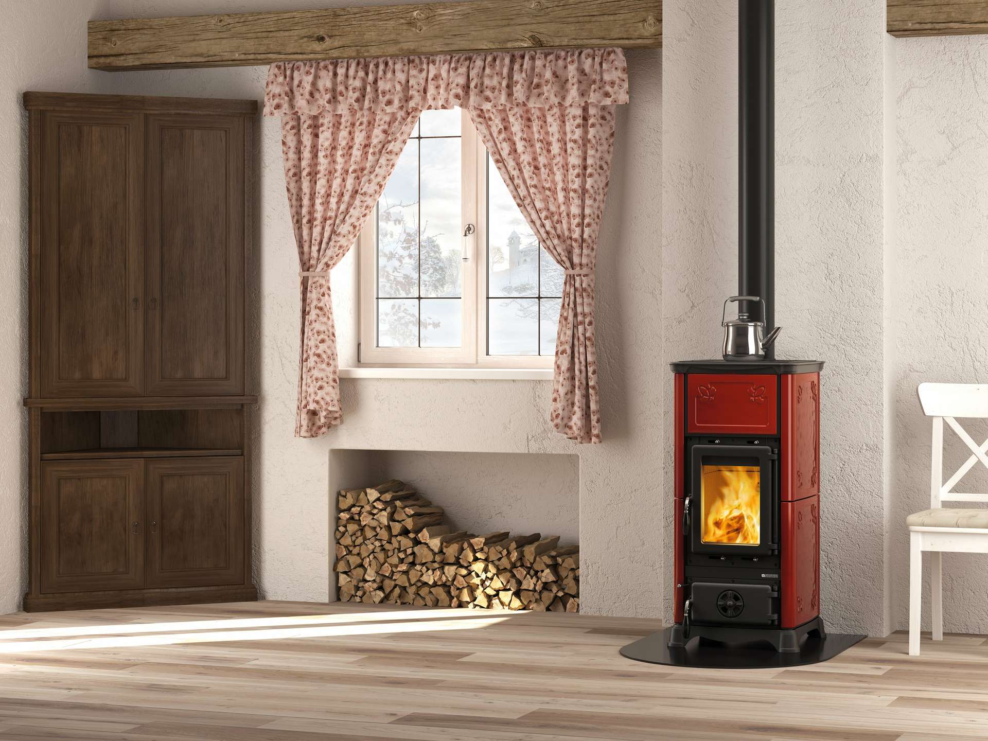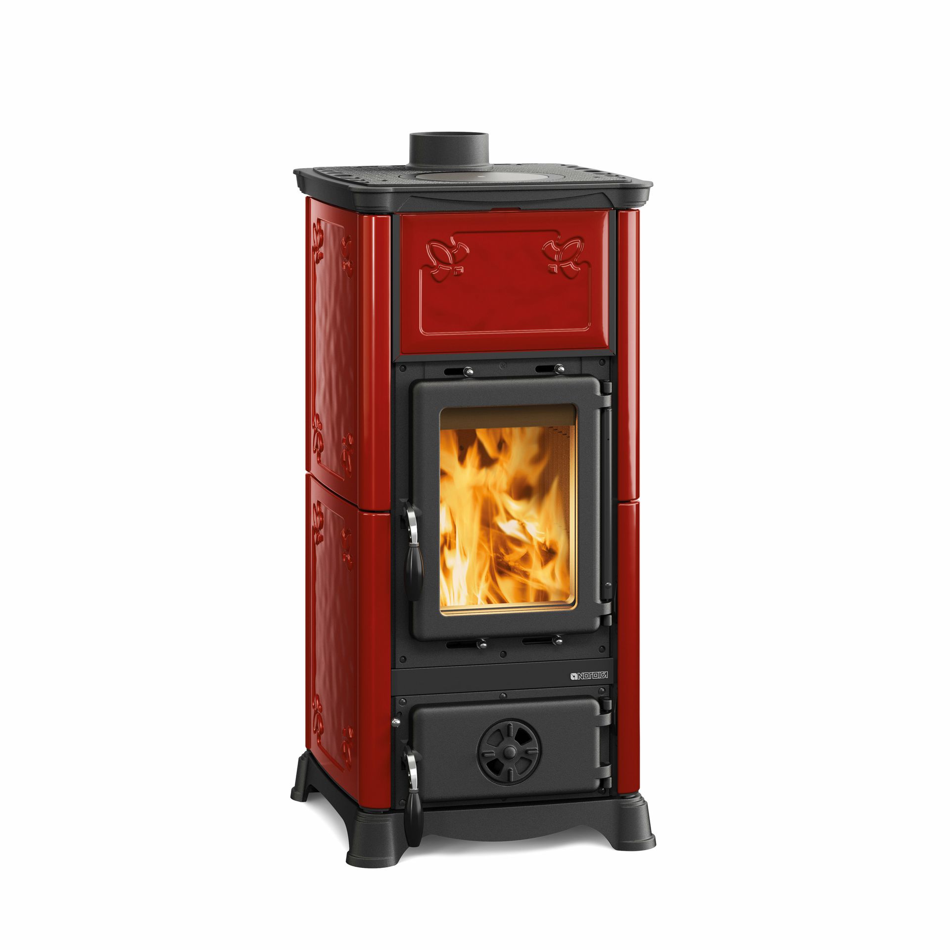 Peč na drva z ročno izdelano oblogo iz majolike. Emajlirana litoželezna vrata, zgornji del, podnožje in okvir. Notranja obloga kurišča iz litega železa.
