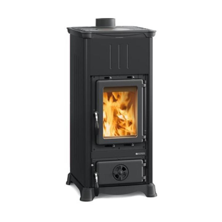 Peč na drva z barvano jekleno prevleko. Emajlirana litoželezna vrata, zgornji del, podstavek in okvir. Notranja obloga kurišča iz litega železa.