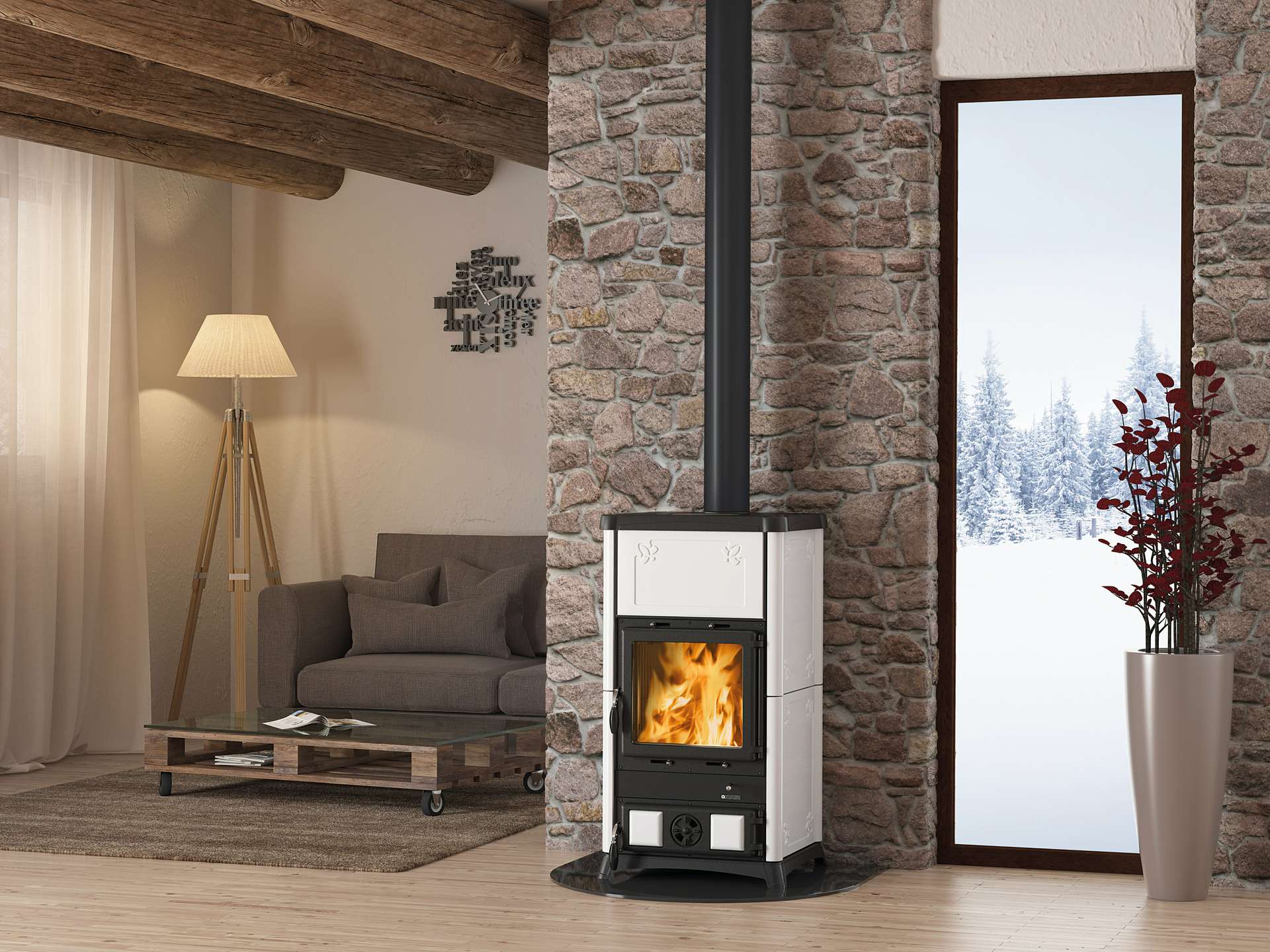 Peč na drva z ročno izdelano oblogo iz majolike. Vrata, zgornji del, podstavek in okvir iz emajliranega litega železa. Notranja obloga kurišča iz litega železa. Keramično steklo.