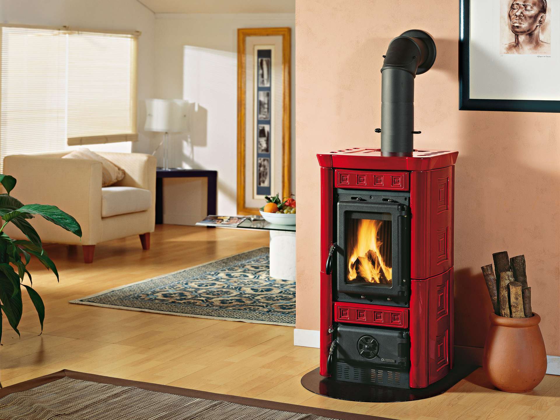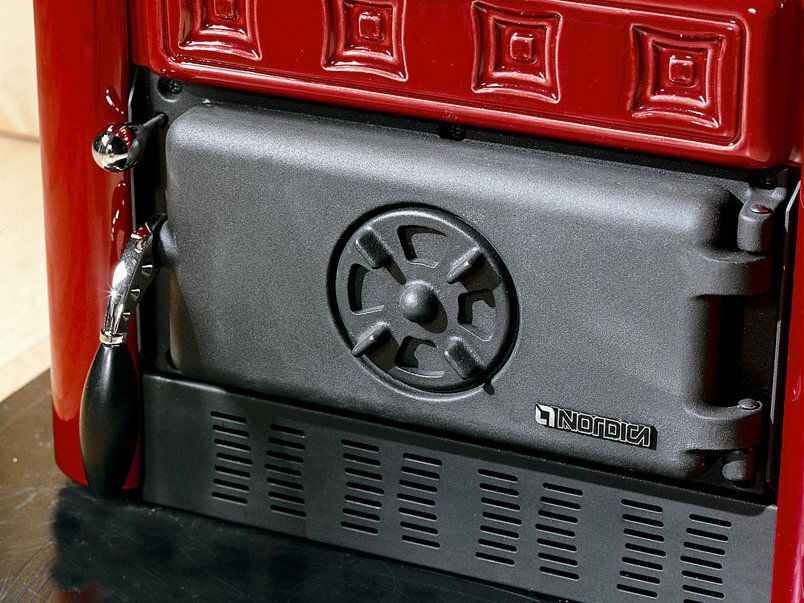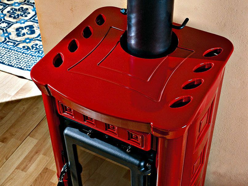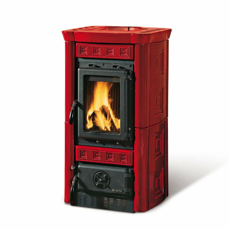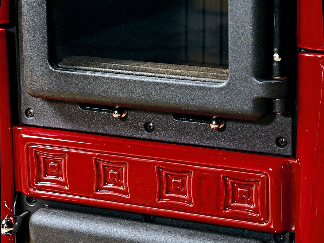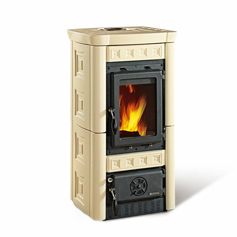 Peč na drva z ročno izdelano oblogo iz majolike. Vrata in okvir iz emajliranega litega železa. Notranja obloga kurišča iz litega železa. Keramično steklo.
