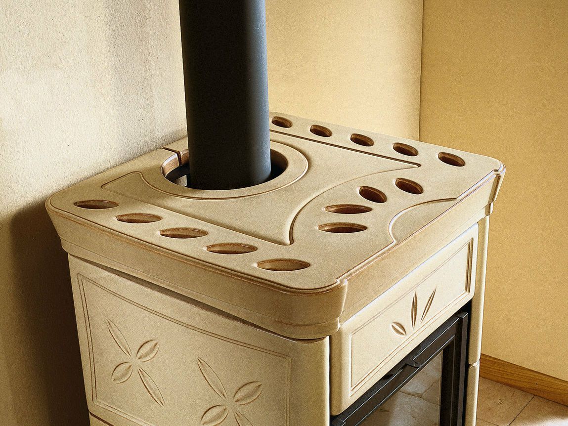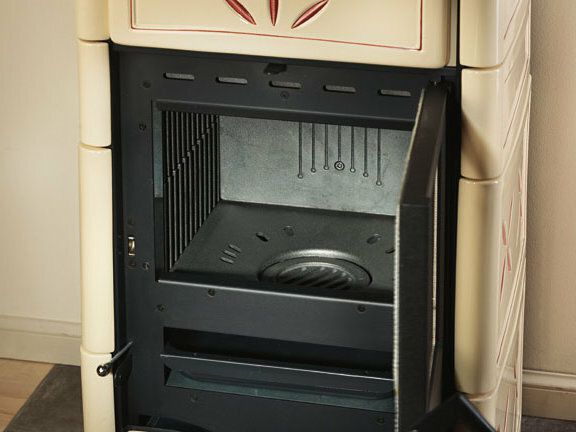 Peč na drva z ročno izdelano oblogo iz majolike. Vrata iz emajliranega litega železa. Notranja obloga kurišča iz litega železa. Keramično steklo s širokim pogledom na ogenj.