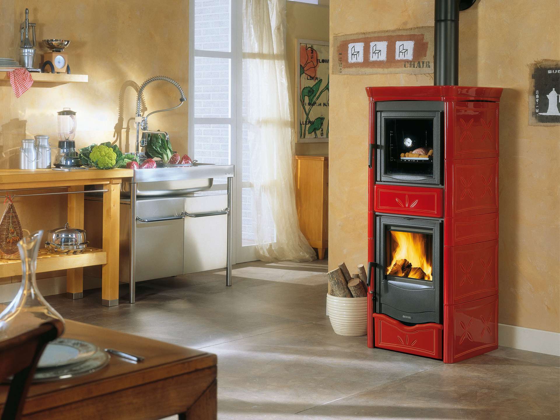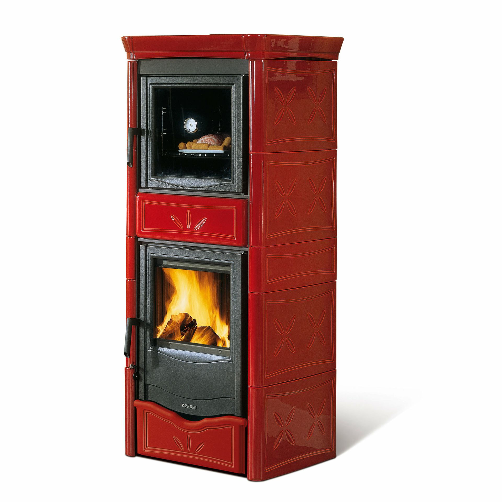 Peč na drva z ročno izdelano oblogo iz majolike. Vrata iz emajliranega litega železa. Notranja obloga kurišča iz litega železa. Keramično steklo s širokim pogledom na ogenj.