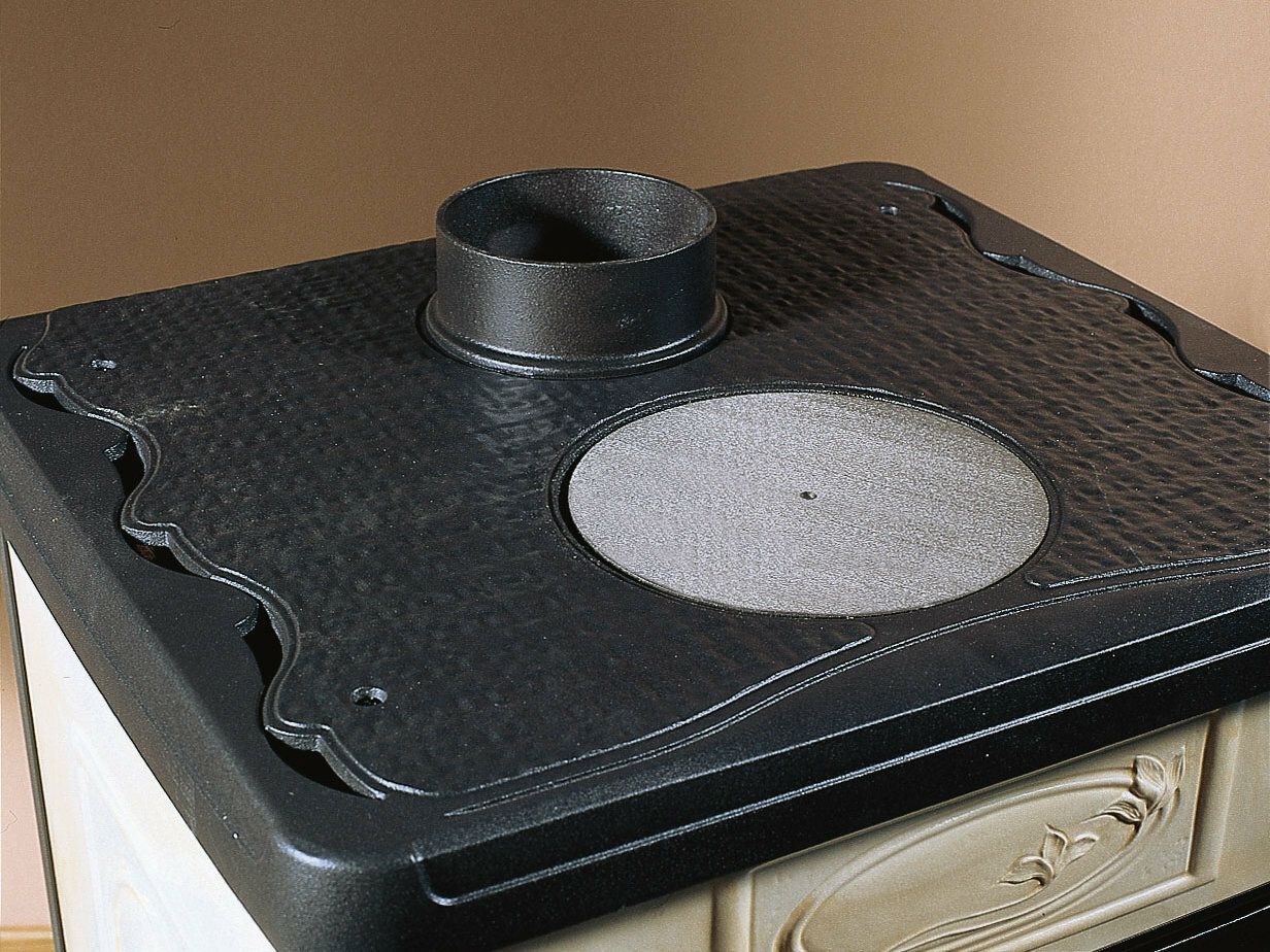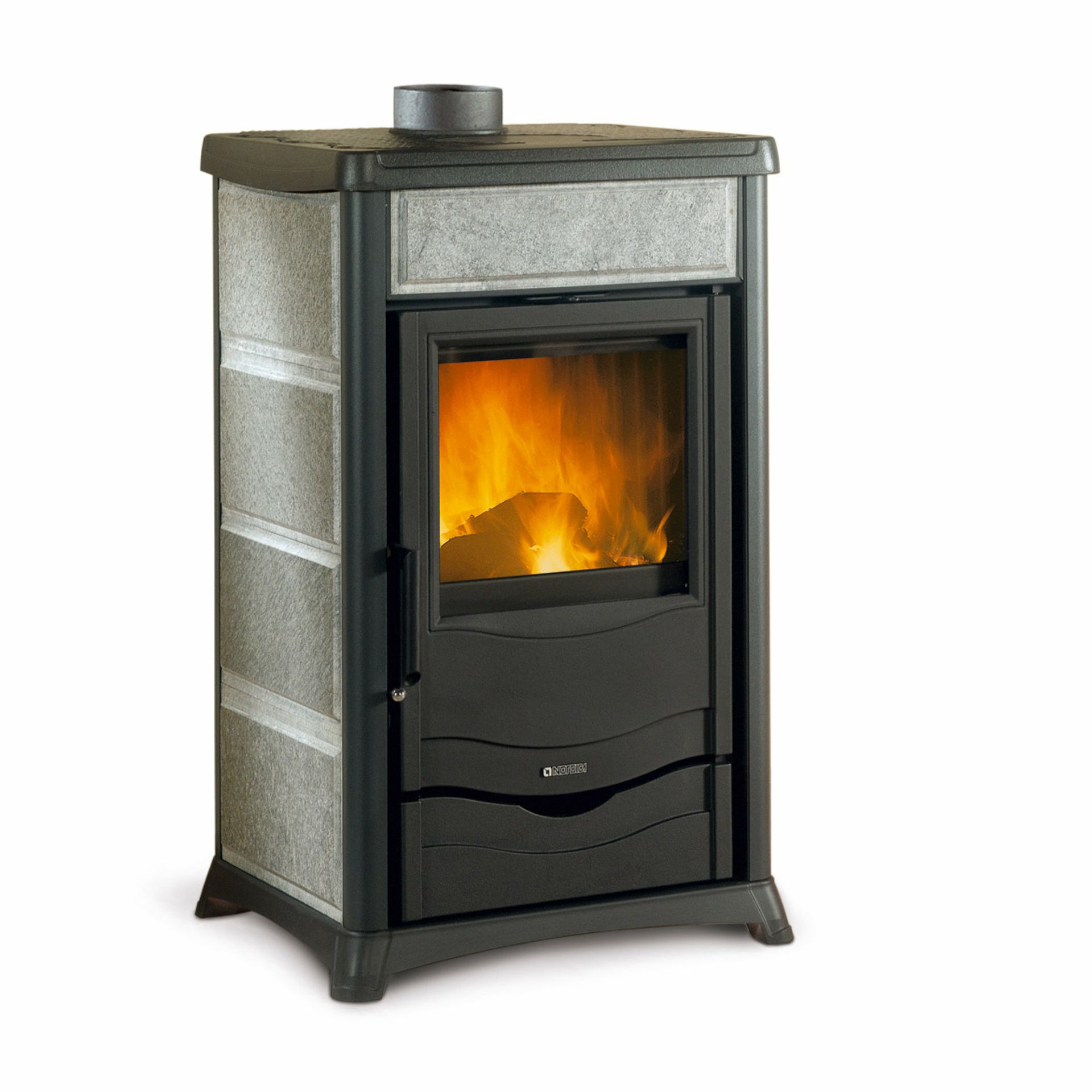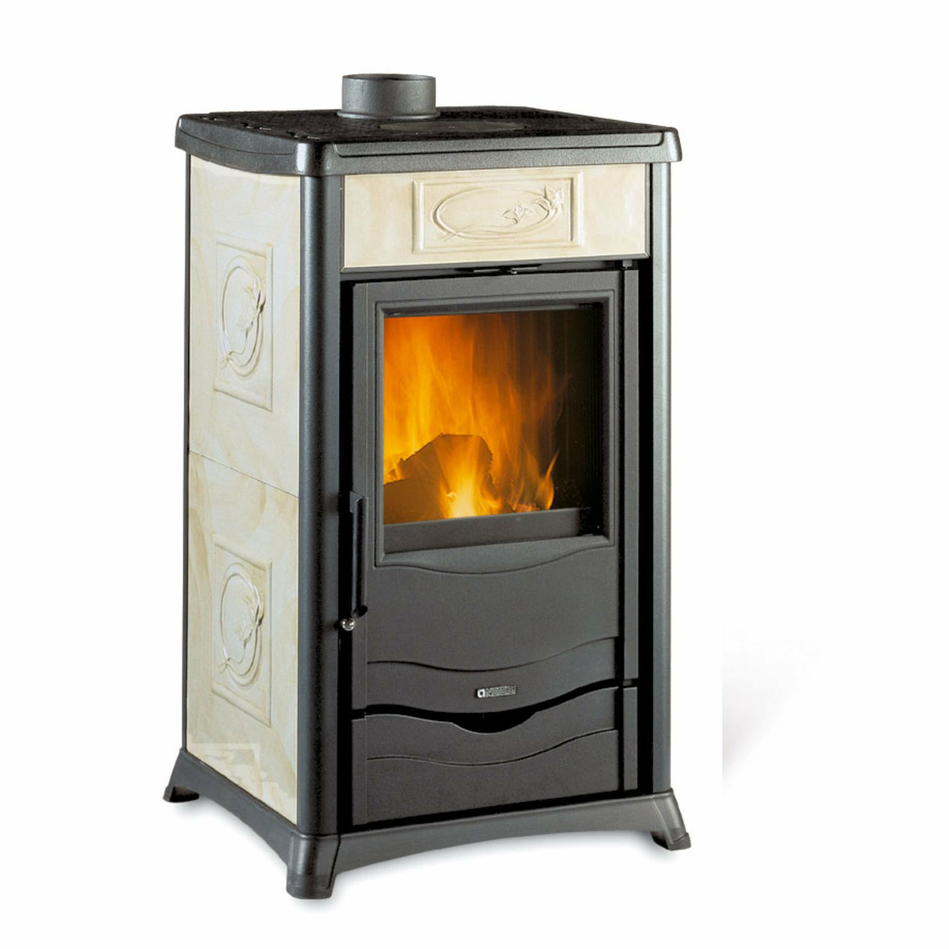 Peč na drva z zunanjo oblogo iz majolike ali naravnega kamna. Izvlečni predal za drva. Zgornji del, vrata in podstavek iz emajliranega litega železa. Notranja obloga kurišča iz litega železa. Keramično steklo s širokim pogledom na ogenj.