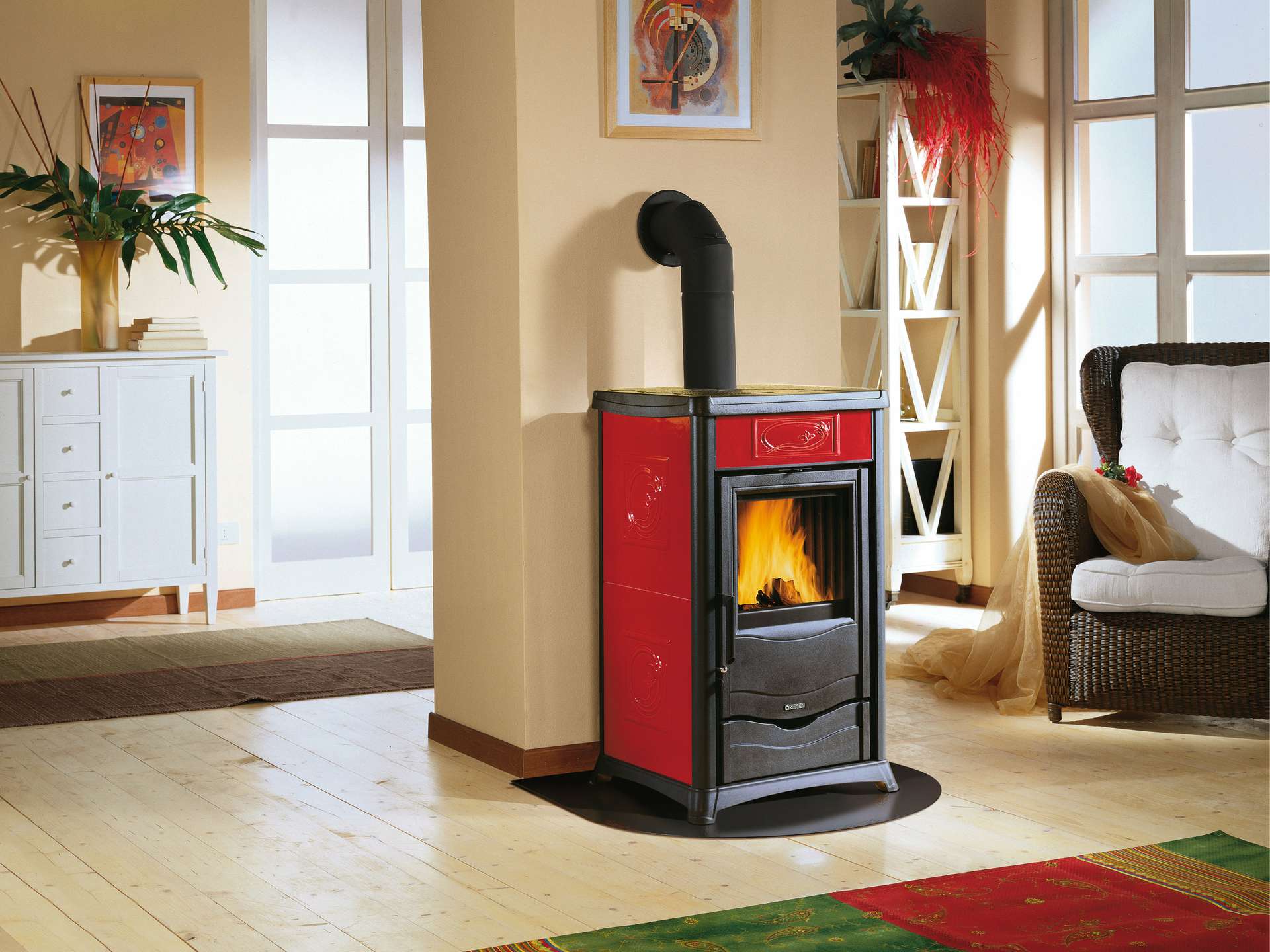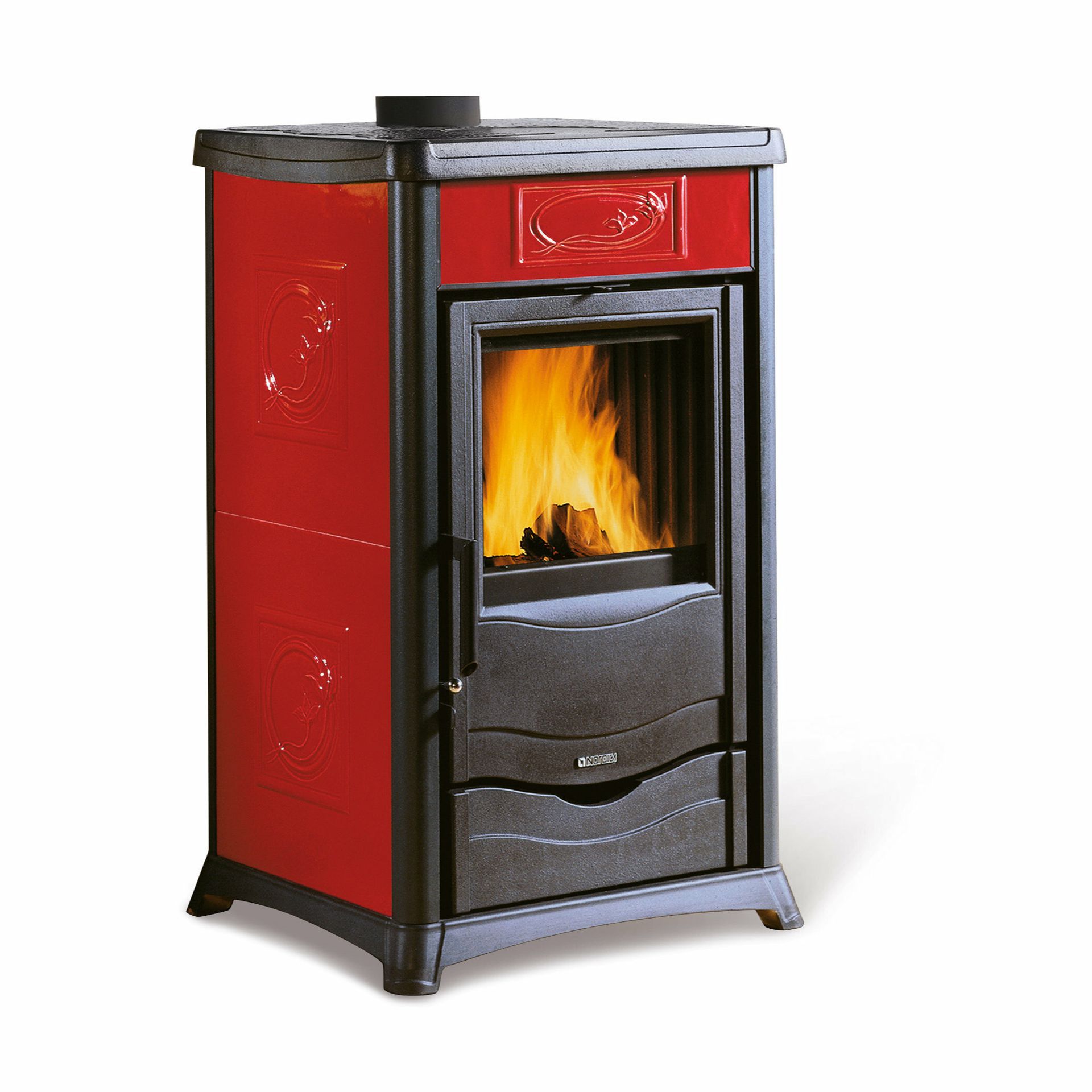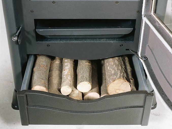 Peč na drva z zunanjo oblogo iz majolike ali naravnega kamna. Izvlečni predal za drva. Zgornji del, vrata in podstavek iz emajliranega litega železa. Notranja obloga kurišča iz litega železa. Keramično steklo s širokim pogledom na ogenj.