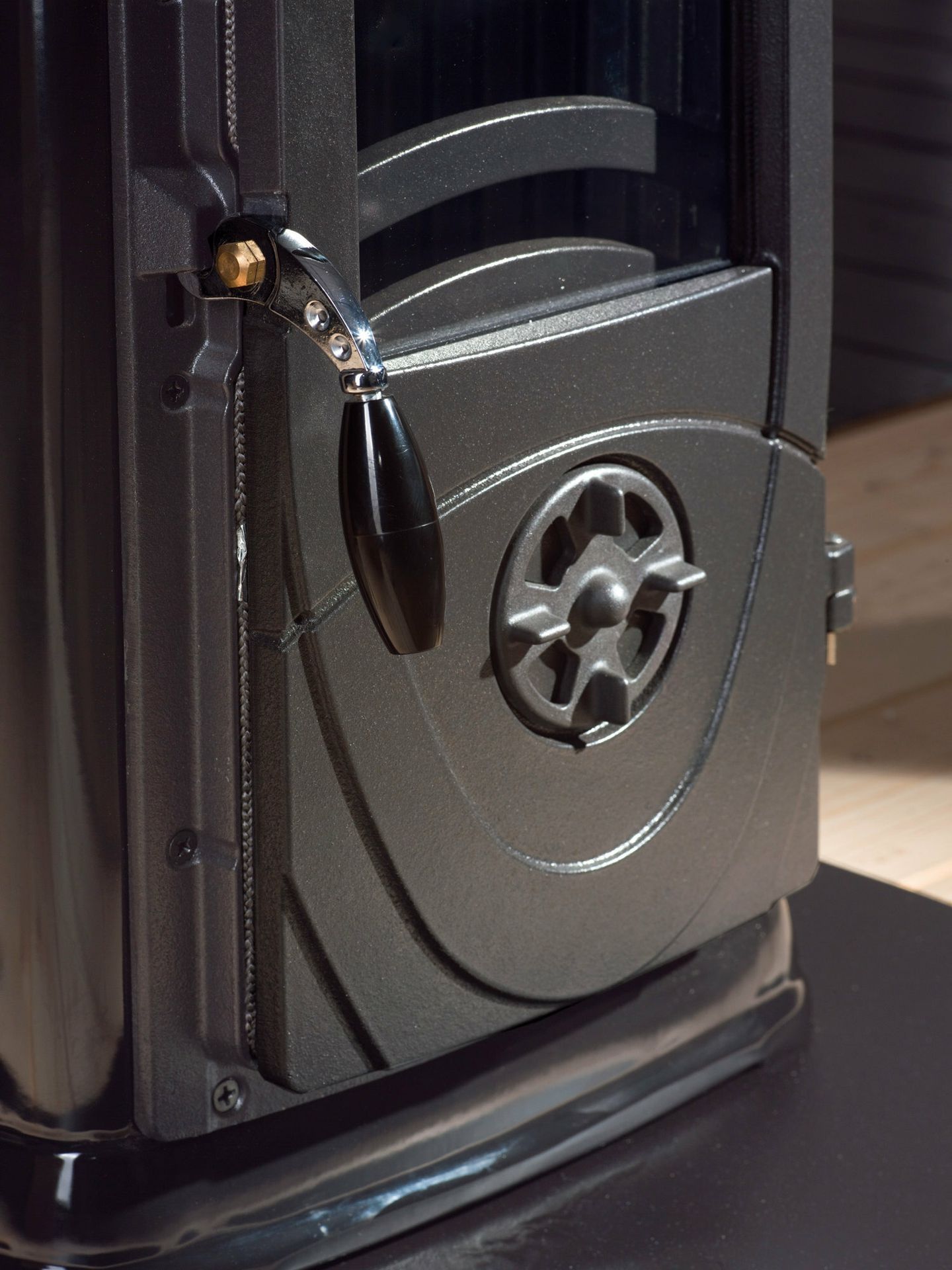 Peč na drva z vrati, zgornjim delom, podstavkom in okvirjem iz emajlirane litine. Pretresalnik rešetke. Kromirani medeninasti ročaji.