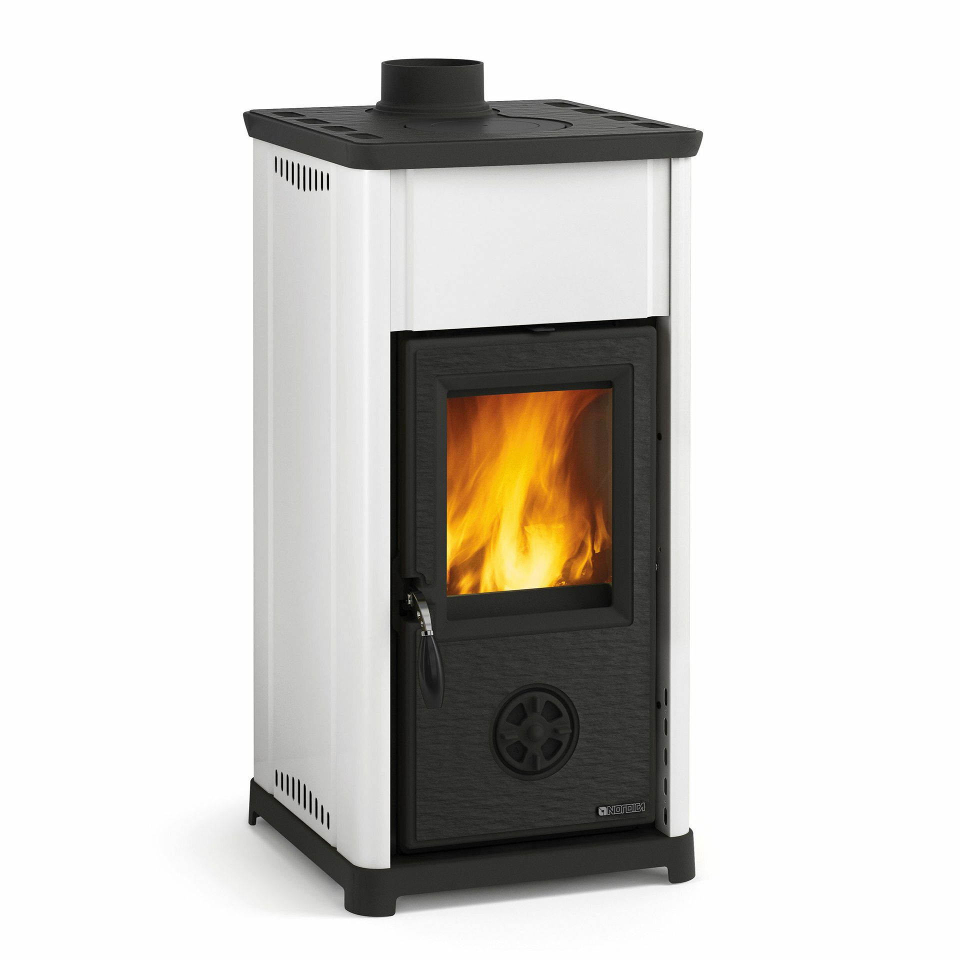 Peč na drva z vrati, zgornjim delom in podstavkom iz emajliranega litega železa. Notranja obloga kurišča iz ognjevzdržnega materiala. Premična rešetka. Keramično steklo.